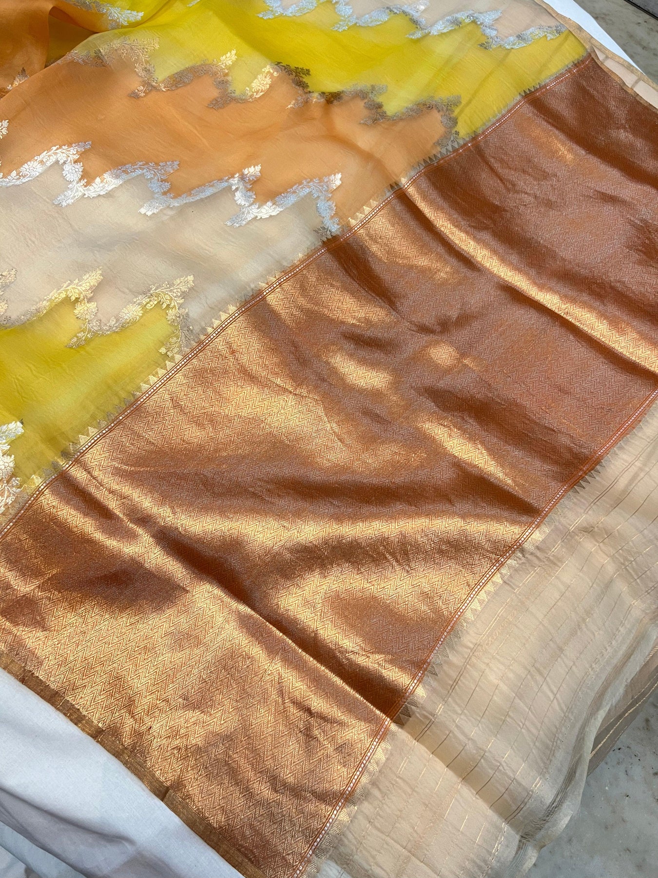 Cream-Peach Rangkaat Banarasi Handloom Kora Silk Saree