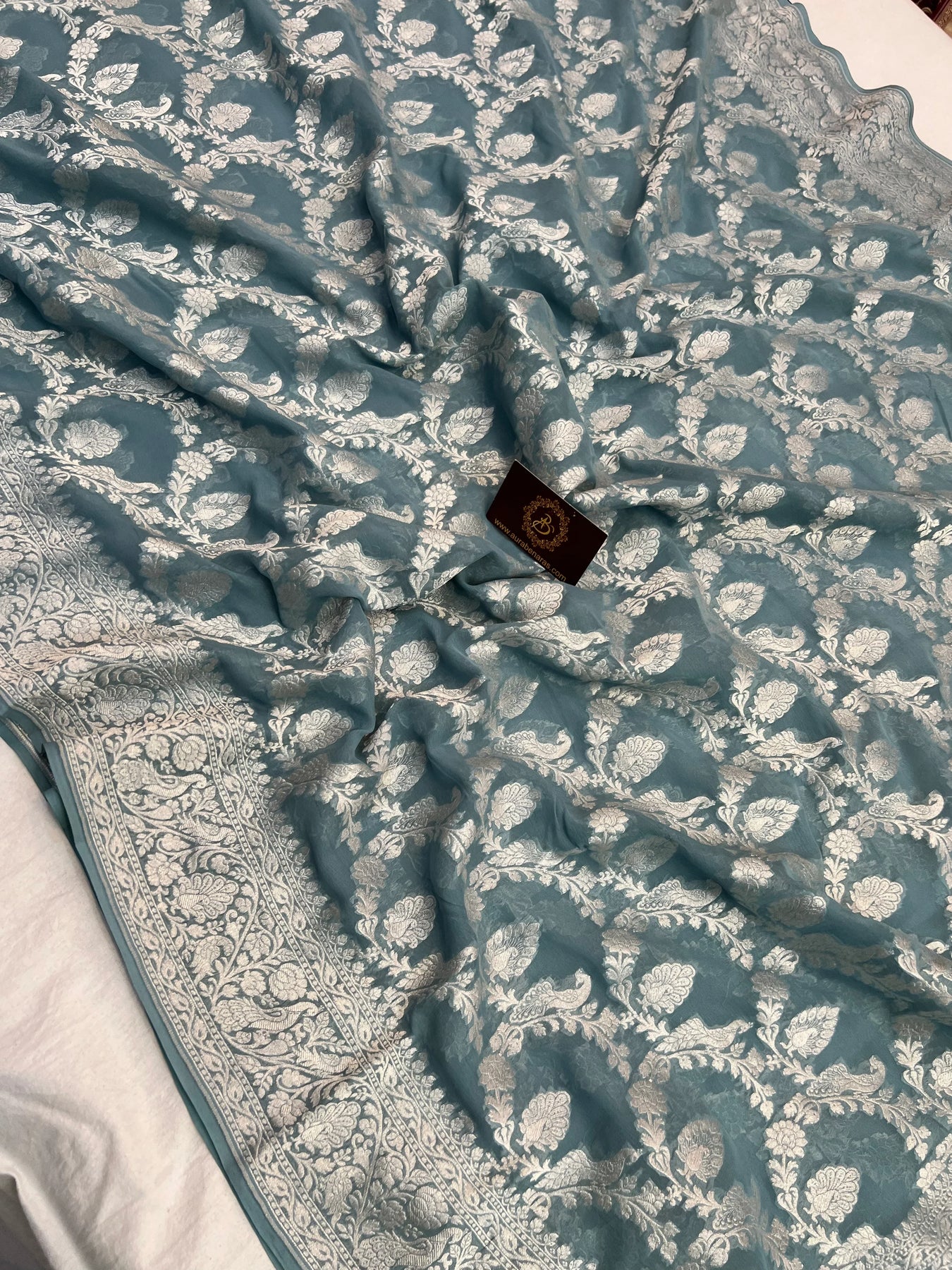 Grey Blue Pure Khaddi Georgette Handloom Banarasi Saree