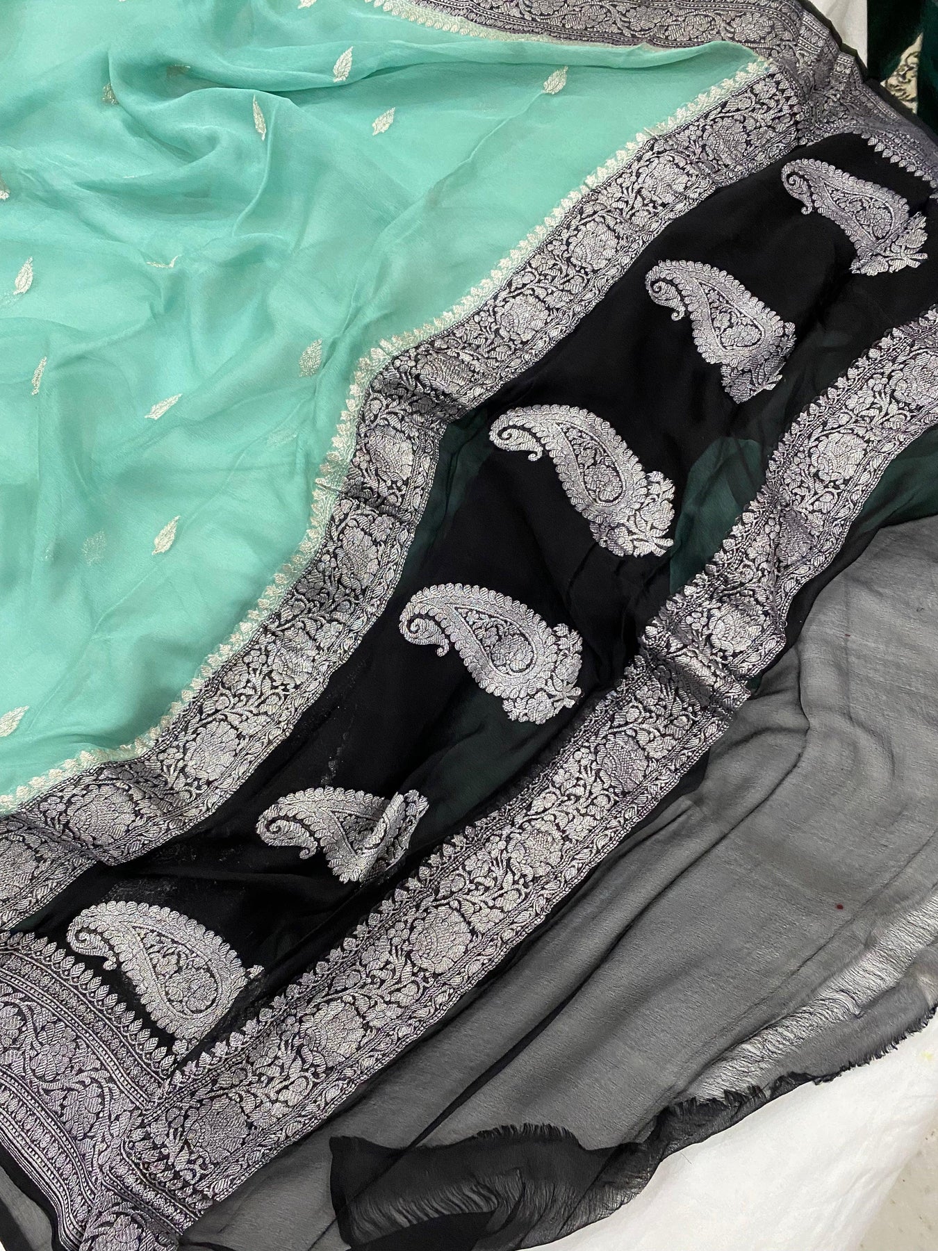 • Color - An enchanting Greyish Green with scintillating black palla and border.