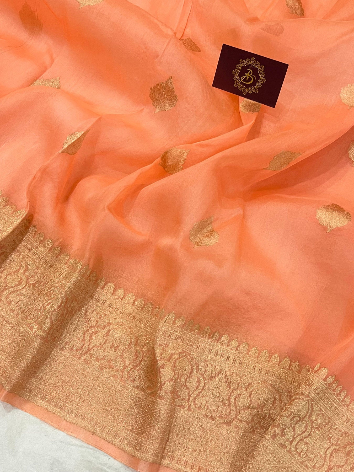 Peach Banarasi Handloom Kora Silk Saree - Aura Benaras