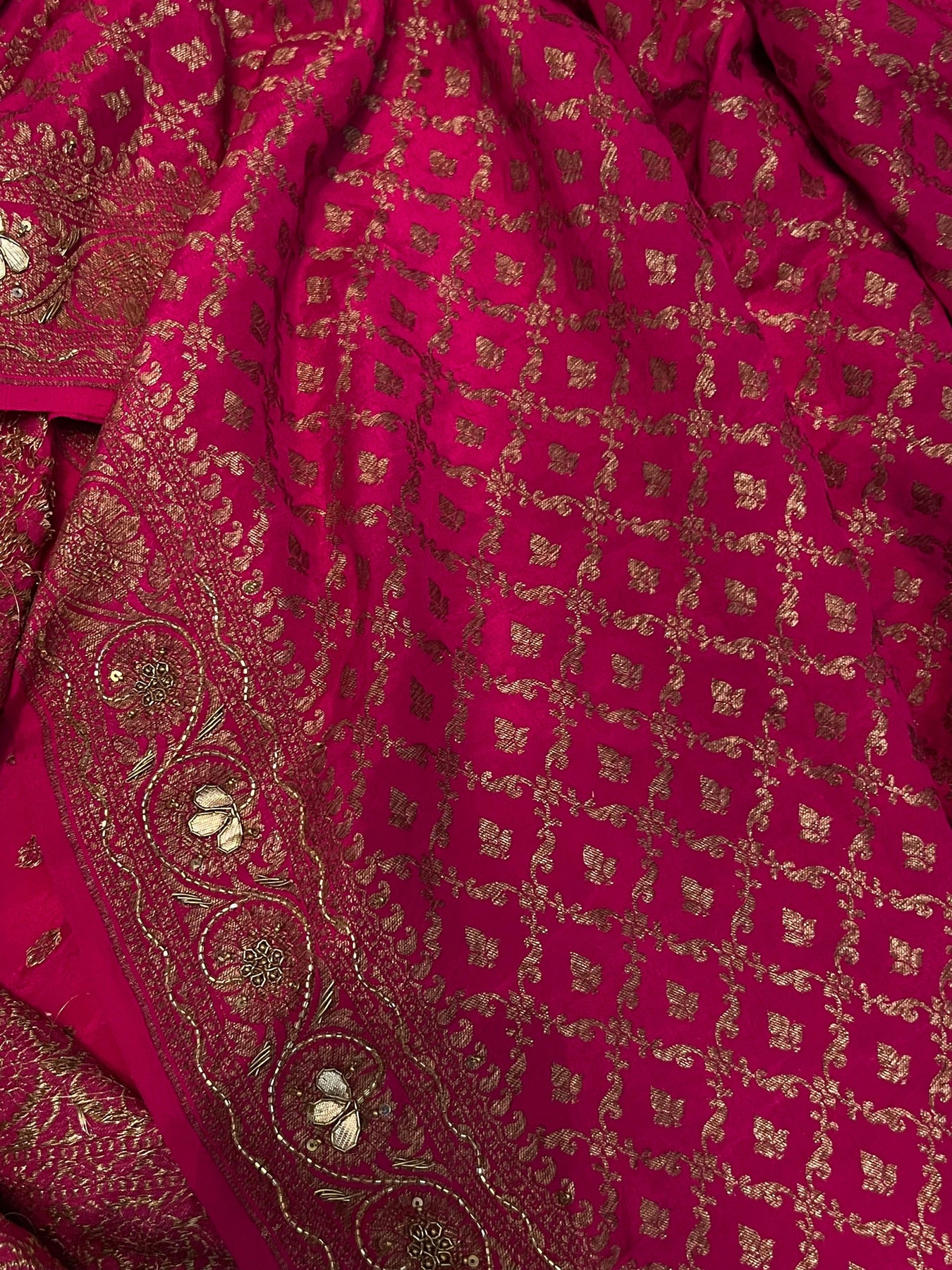 A stunning Rani pink Banarasi handloom classic. The authentic motifs in antique zari with zardozi work handwoven in the finest chiffon georgettes, comes with a same color heavy jaal work blouse. It takes around 10 days to weave this rich and luxurious piece of our tradition.