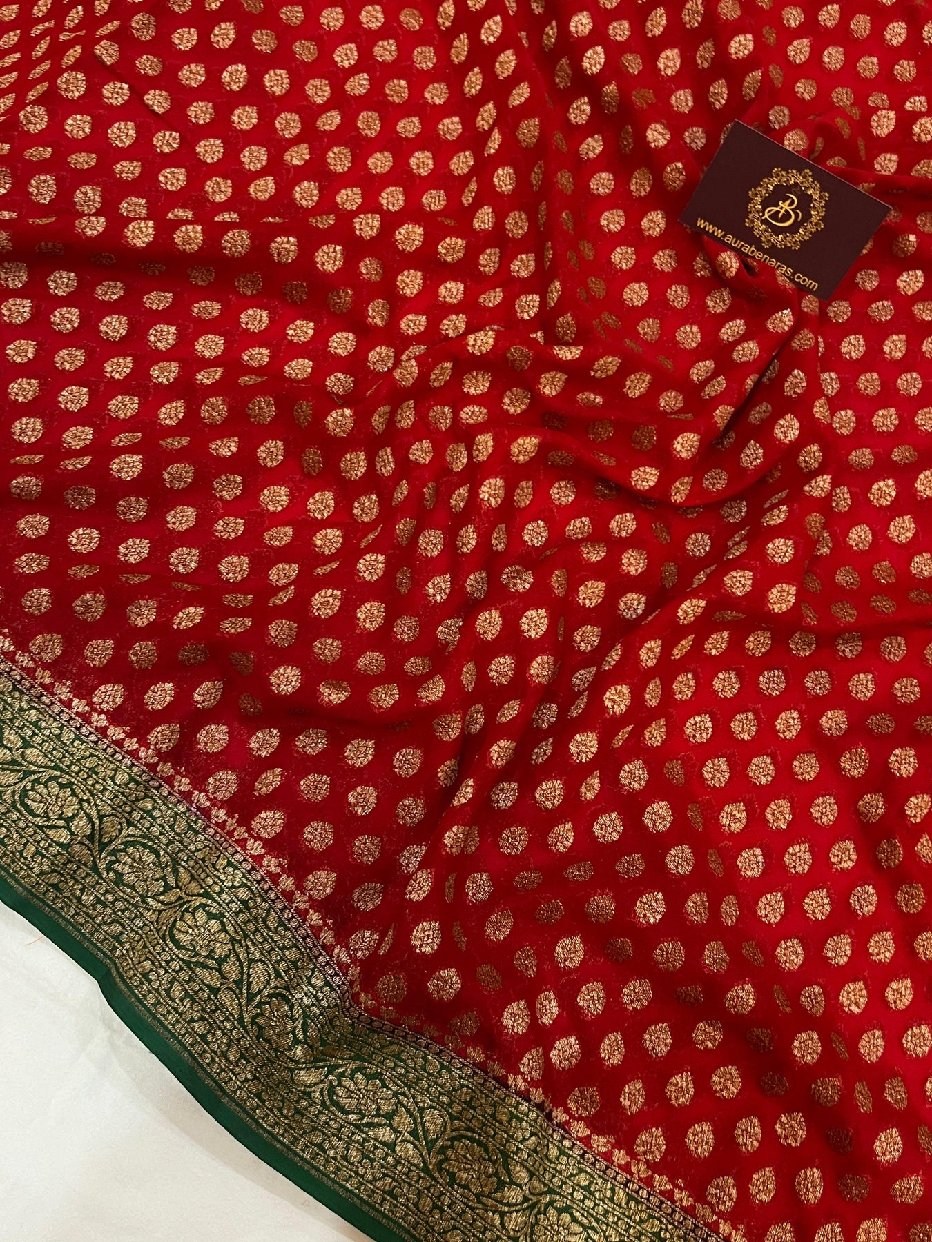 A stunning Red Banarasi handloom classic.The authentic buti work with antique zari handwoven in the finest chiffon georgettes, comes with a contrast plain blouse.It takes around 10 days to weave this rich and luxurious piece of our tradition.