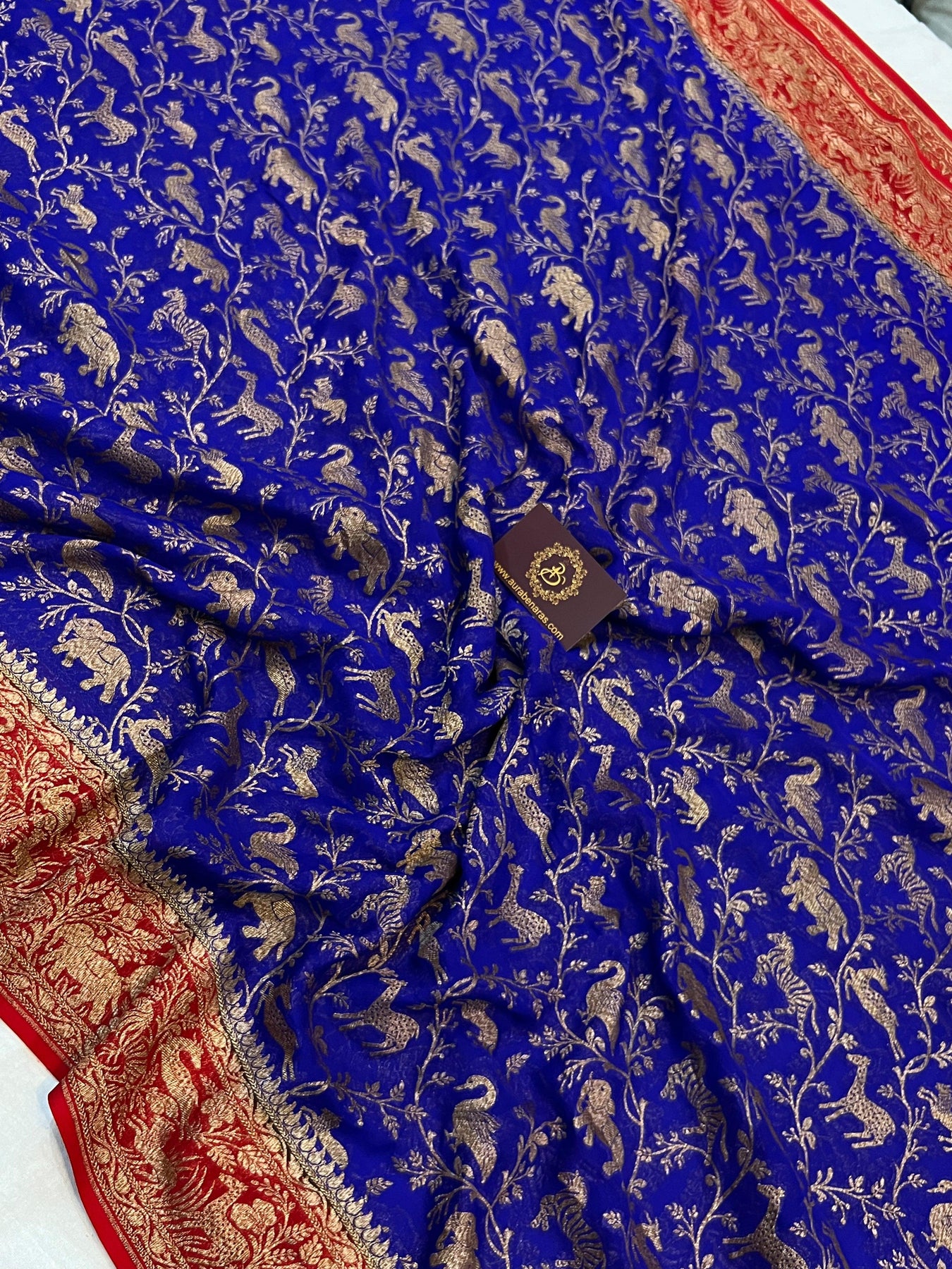 Indulge yourself with the elegance of Banaras with this Royal Blue saree. The minute, antique zari shikargaah jaal design over the saree and edges, gives the royal look to you & make you shine with richness and love at every occasion.