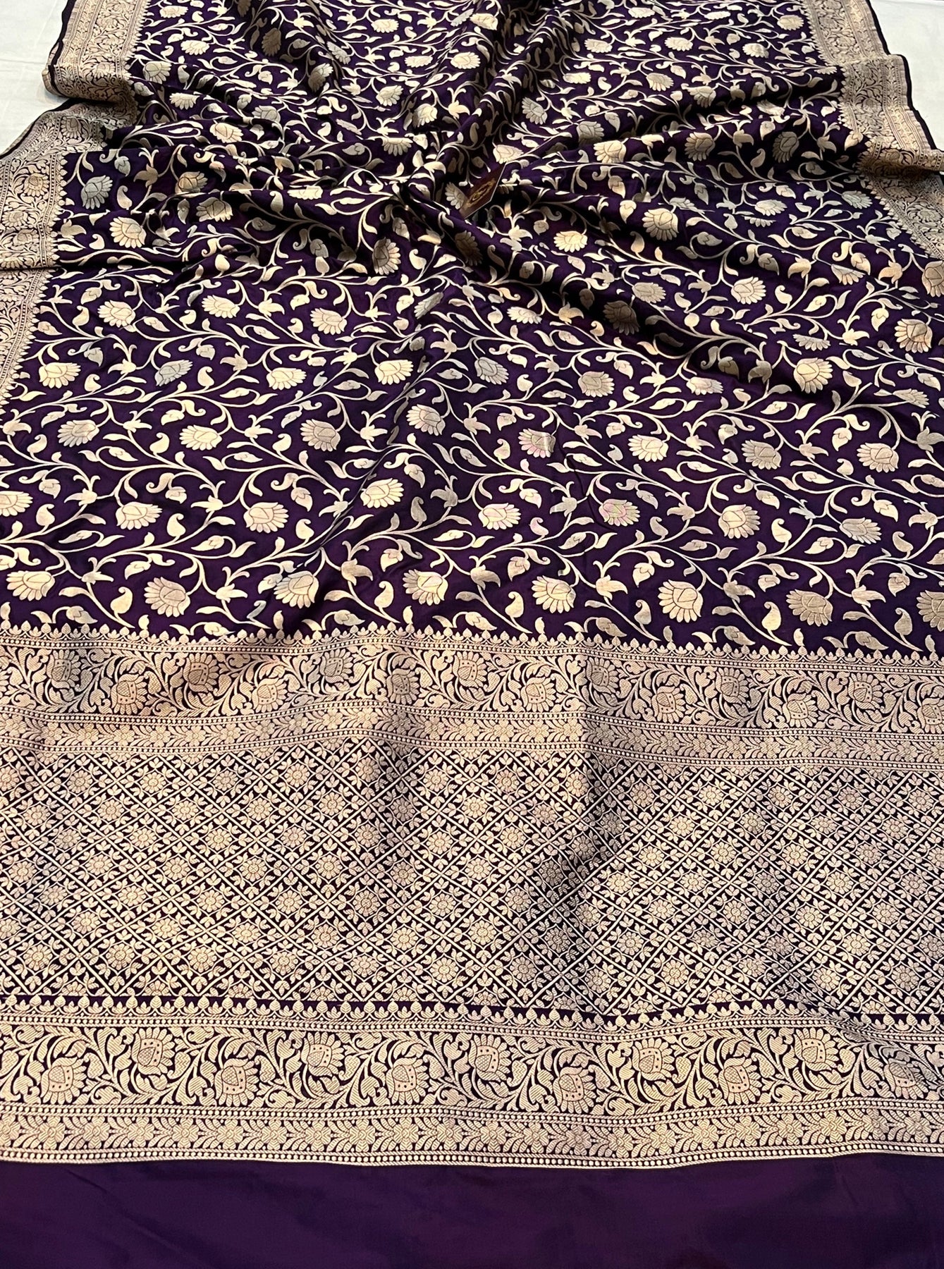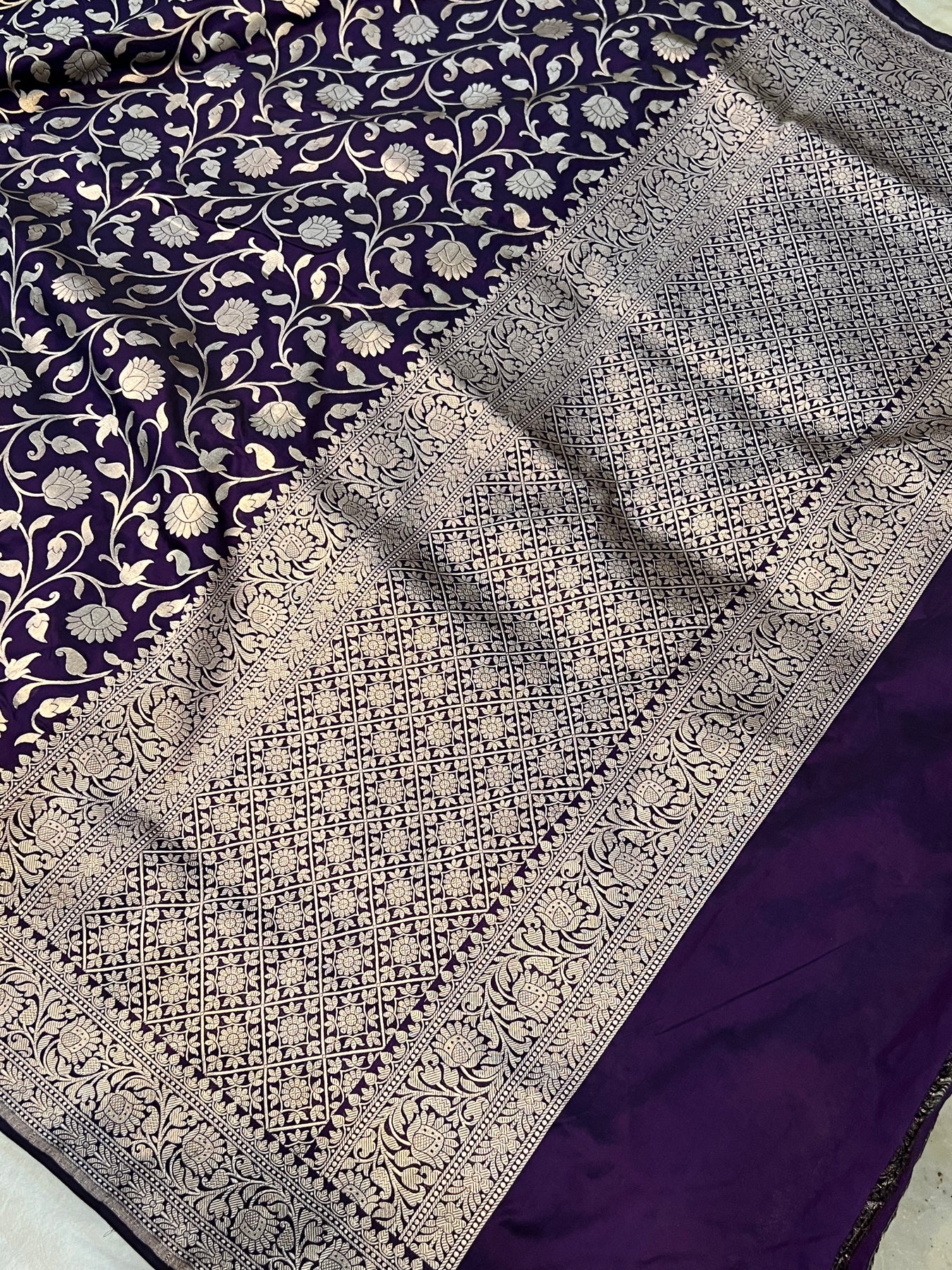 This magnificent piece is testament to the art possessed by our weavers. Made on pure katan silk, this authentic saree has all over jaal work with beautiful border and pallu. It comes with a same colored pure katan silk plain blouse with border. It takes our master craftsmen 12-18 days to weave this piece of tradition.