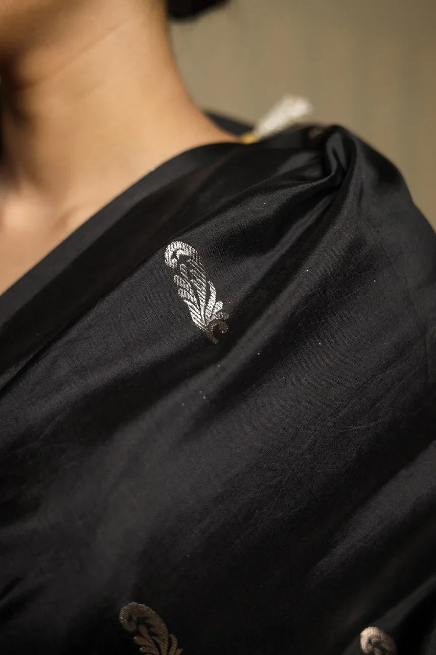 Turn heads with timeless elegance in this black pure silk handloom Banarasi saree, a masterpiece woven with precision and tradition. Crafted from the finest Katan silk, this saree features exquisite Kadhwa butis delicately scattered across the body — each one handwoven using the age-old Kadhwa technique, celebrated for its durability and intricate detailing.