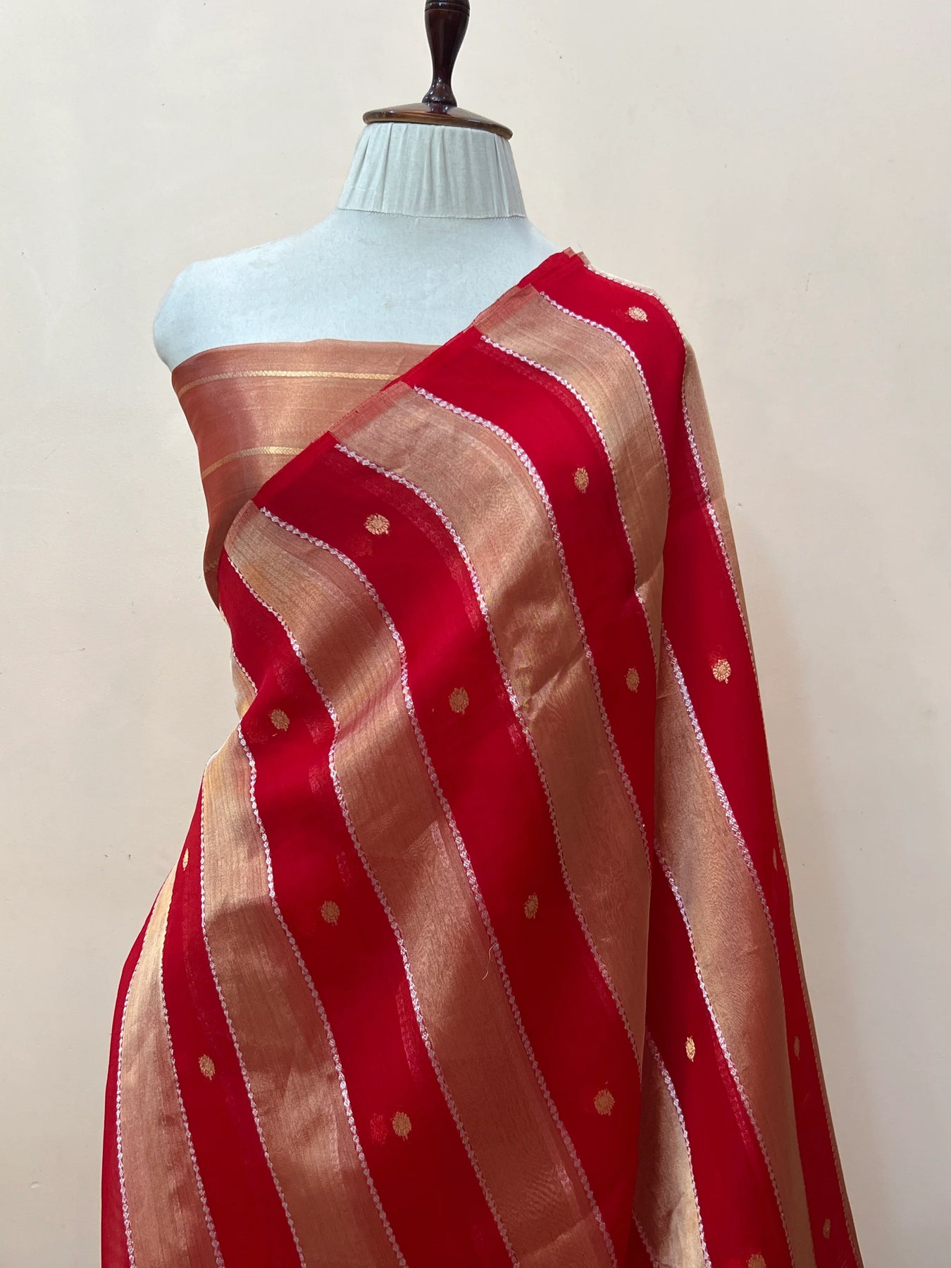 Red Kora Tissue Banarasi Saree with Stripes & Butis