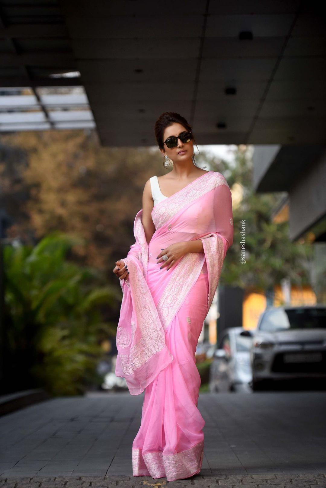 Indulge yourself with the elegance of Banaras with this pink saree . The minute, metallic silver zari design over the pink and edges, gives the royal look to you & make you shine with richness and love at every occasion.