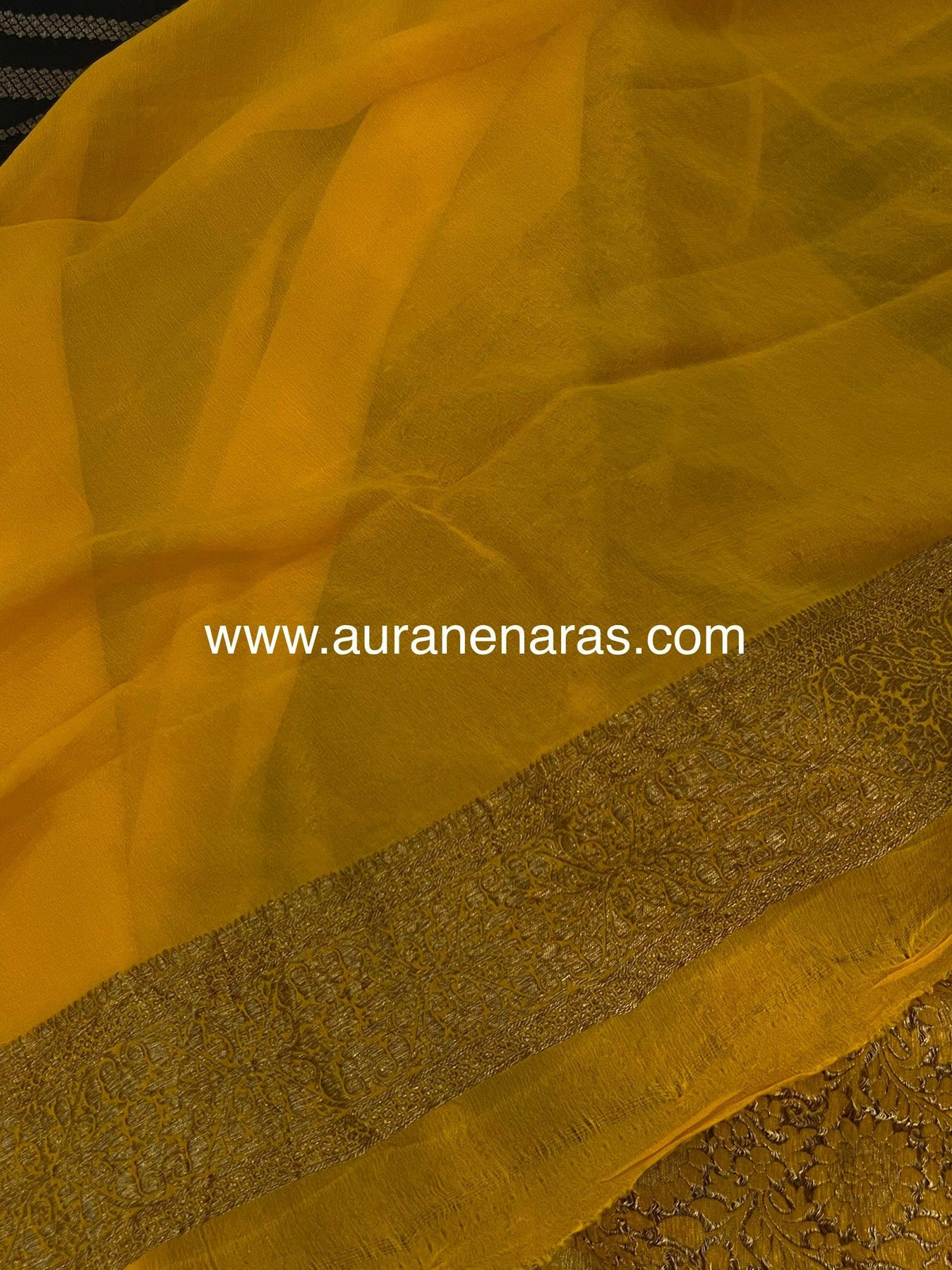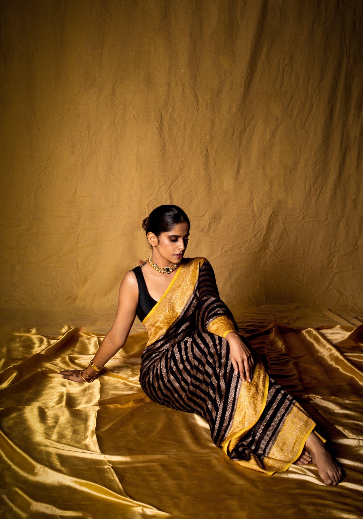 A stunning Black Banarasi handloom classic. The authentic Stripes design in antique zari handwoven in the finest chiffon georgettes, comes with a plain blouse. It takes around 10 days to weave this rich and luxurious piece of our tradition.