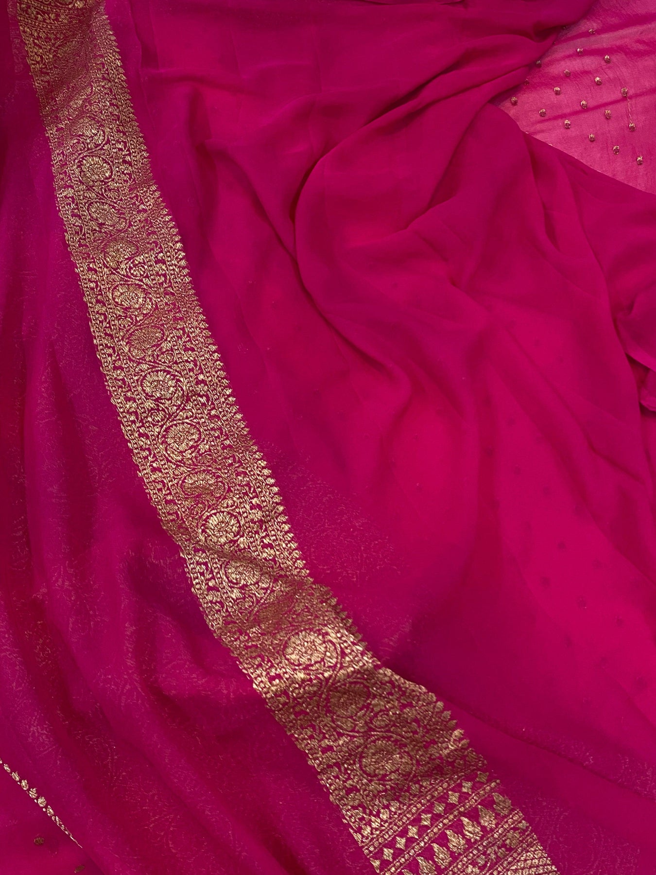 A stunning rani pink Banarasi handloom classic with broad border. The authentic saree with antique zari handwoven in the finest chiffon georgettes, comes with a plain blouse. It takes around 10 days to weave this rich and luxurious piece of our tradition.