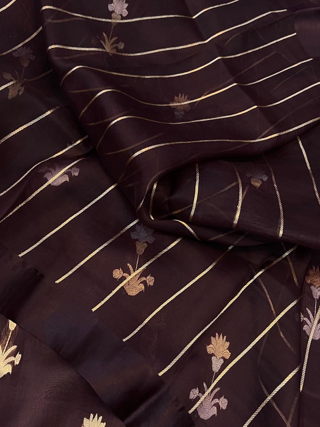 Brown Banarasi Handloom Kora Silk Saree - Aura Benaras