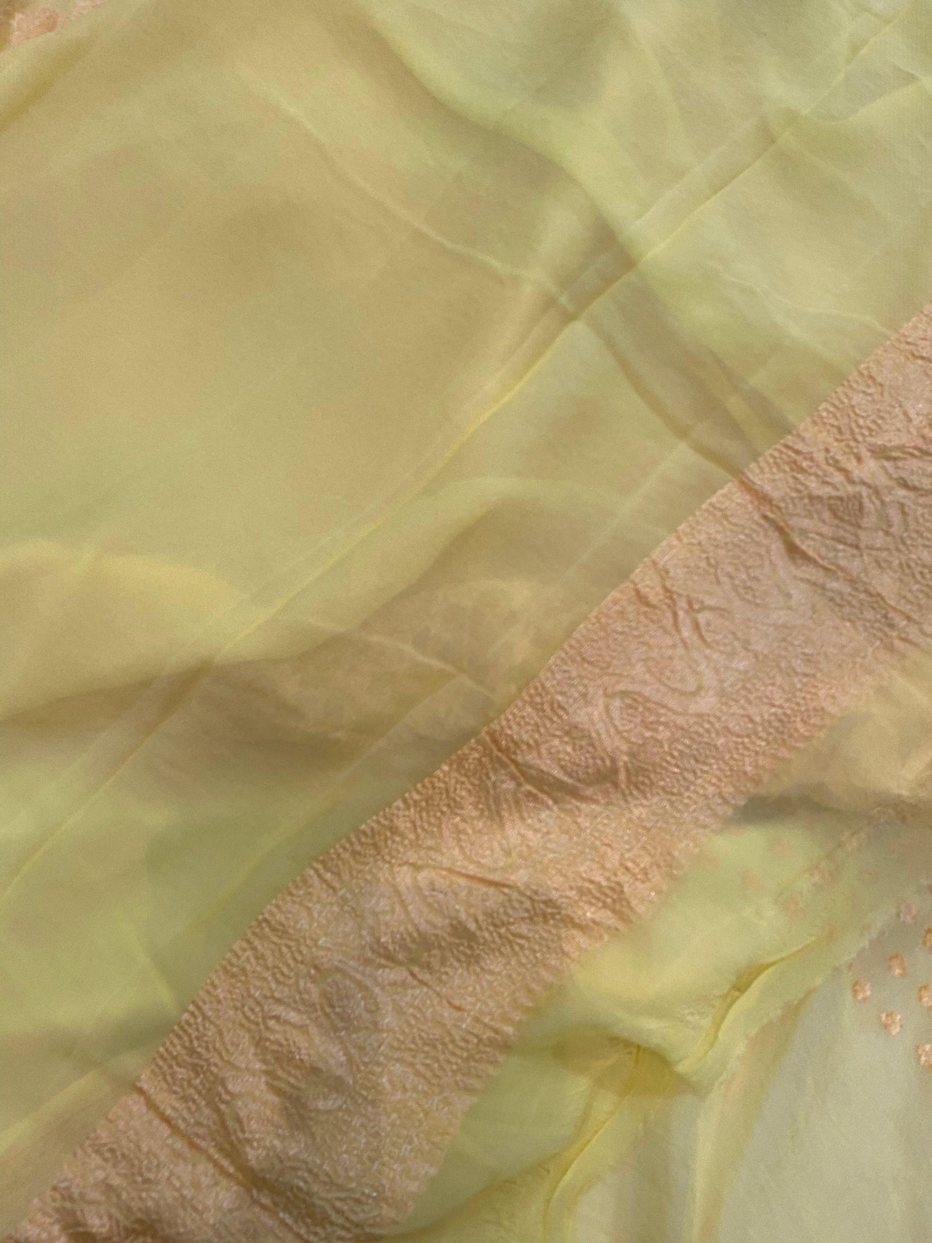 A stunning Lemon Yellow Banarasi handloom classic. The authentic buti work in golden zari handwoven in the finest chiffon georgettes, comes with a plain blouse. It takes around 10 days to weave this rich and luxurious piece of our tradition.