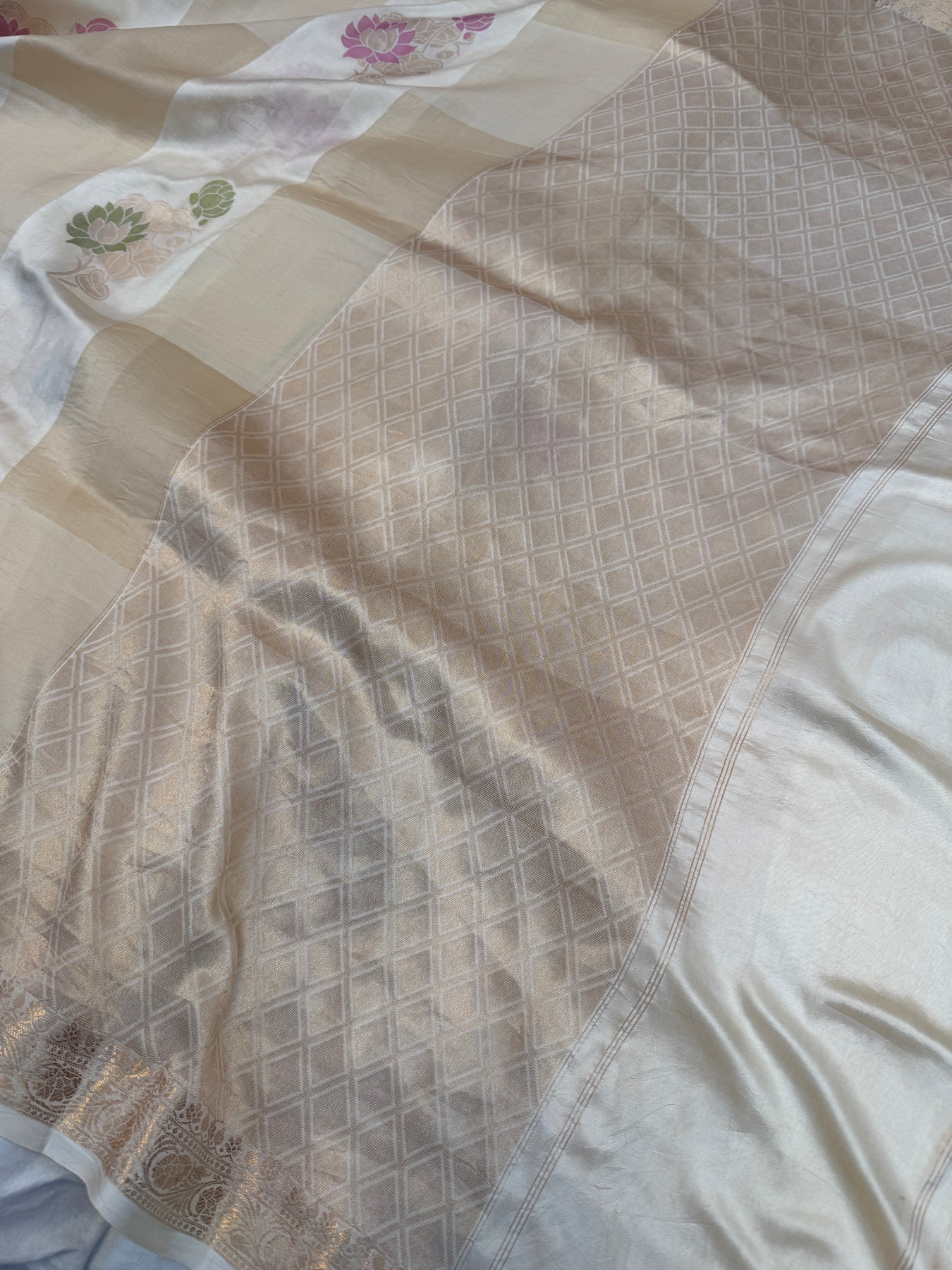 A masterpiece of handloom artistry, this Off White Pure Kora and Silk Banarasi Saree captures the perfect harmony of texture, weave, and tradition. The saree features a stunning checks pattern, where each check is woven in a unique blend — pure silk, kora, silk with kora, and kora with silk — creating a distinctive interplay of sheen and transparency that gives the drape its rich visual depth.