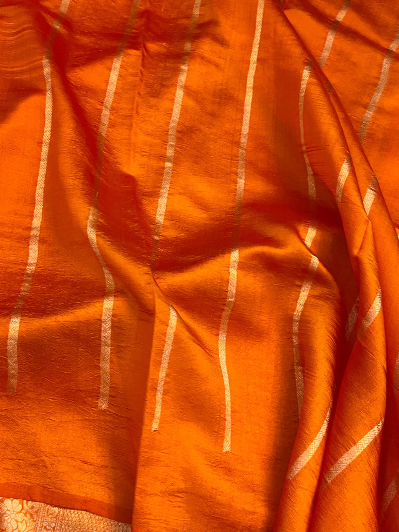 Grace meets grandeur in this stunning Orange pure Banarasi silk saree, handcrafted with timeless elegance. Woven in the heart of Varanasi, this saree features delicate Kadhwa butis—individually handwoven golden zari motifs that float gracefully across the body. The Kadhwa technique ensures no loose threads at the back, giving a refined and rich finish.