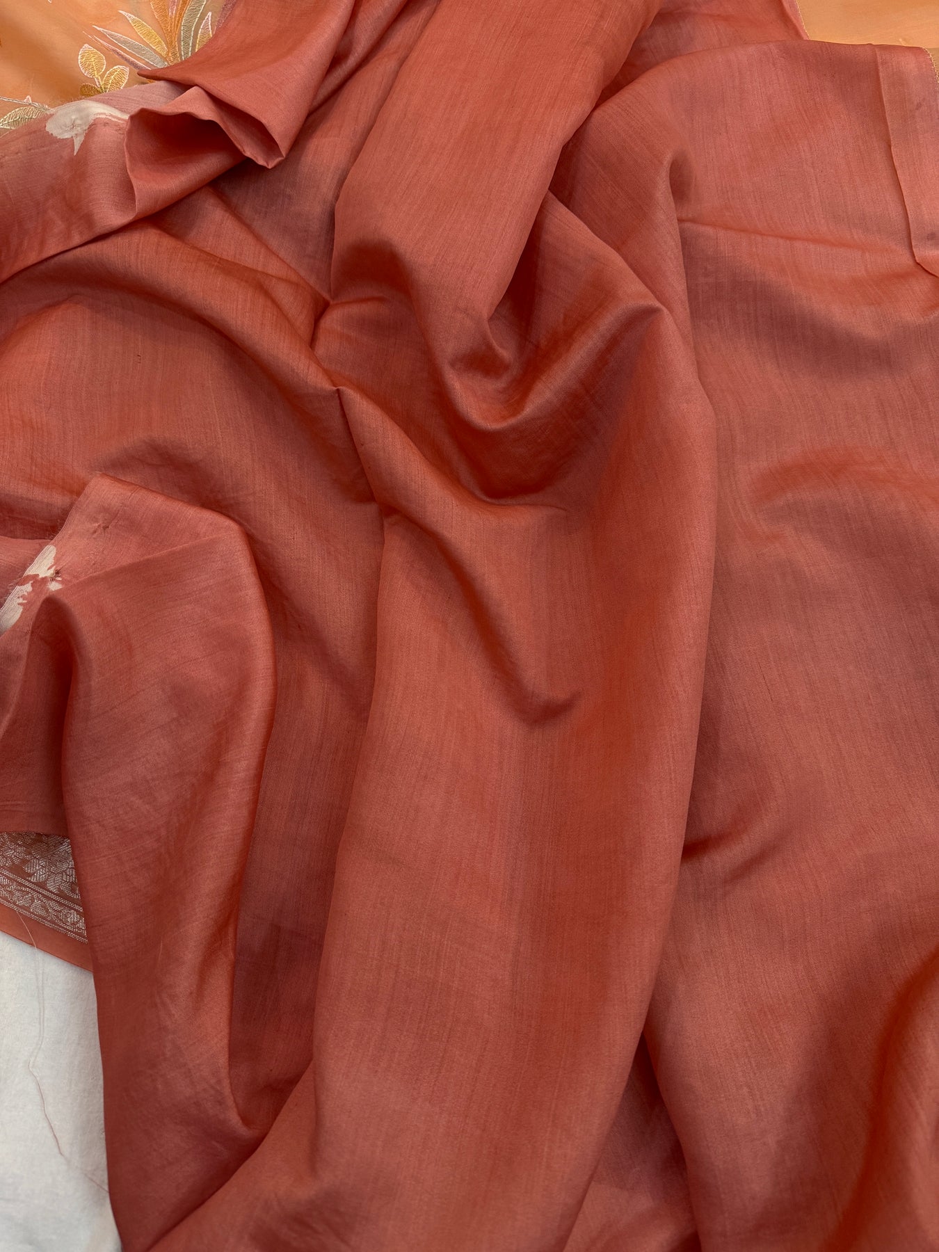 This beautiful Banarasi Pure Kora silk saree is a perfect blend of tradition and modernity. The fabric itself, Kora silk, is light yet luxurious, offering a soft, airy feel while maintaining the opulence that Banarasi silk is known for. What truly stands out is the intricate digital print work, which gives the saree a contemporary twist. The lovely floral butas (motifs) embroidered in multiple vibrant colors add a rich texture, making the saree visually striking. These floral patterns are delicately woven into the fabric, enhancing its traditional charm while incorporating a modern artistic touch through the digital prints.