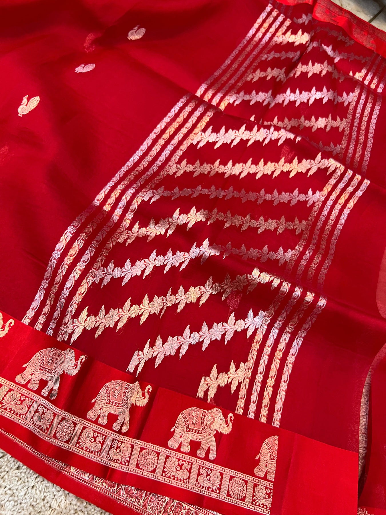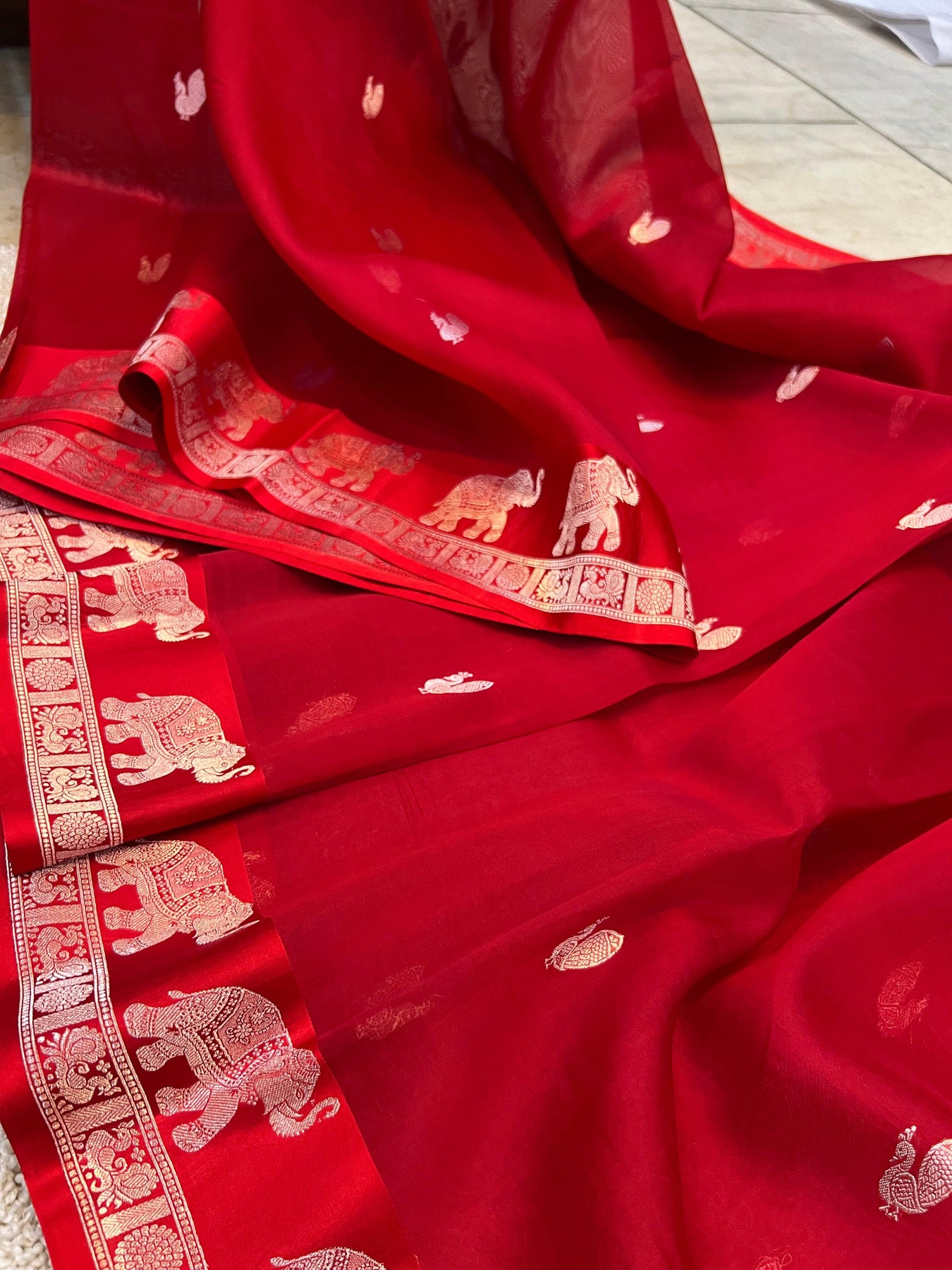 Red Banarasi Handloom Kora Silk Saree - Aura Benaras