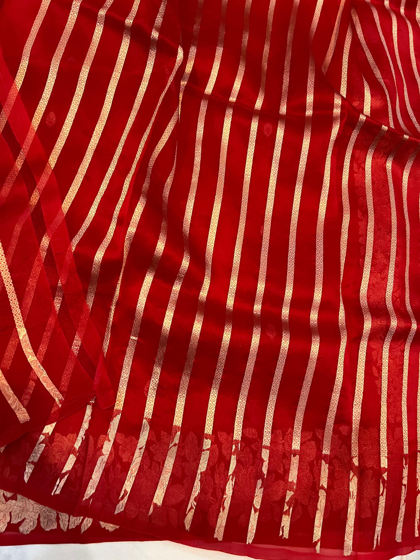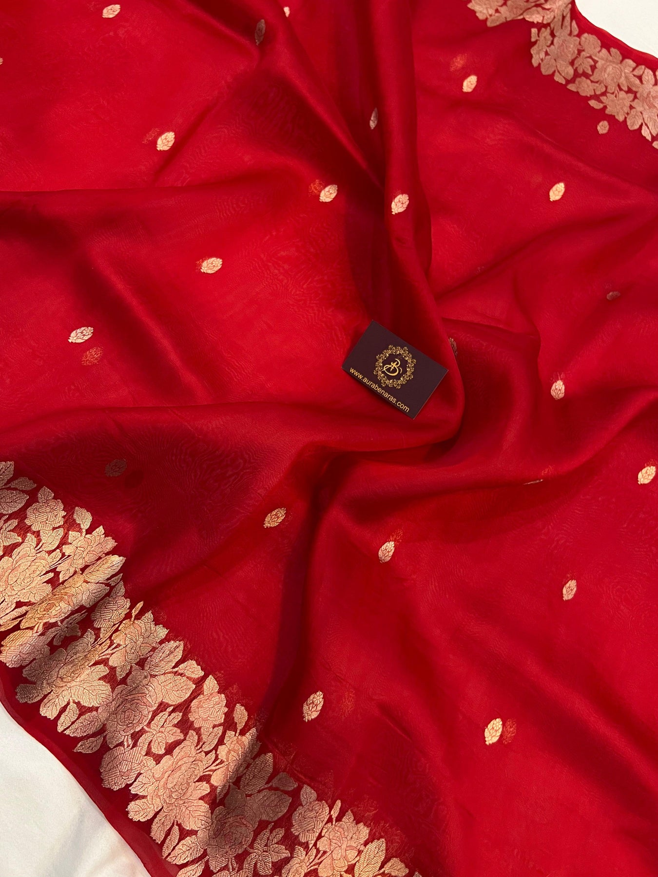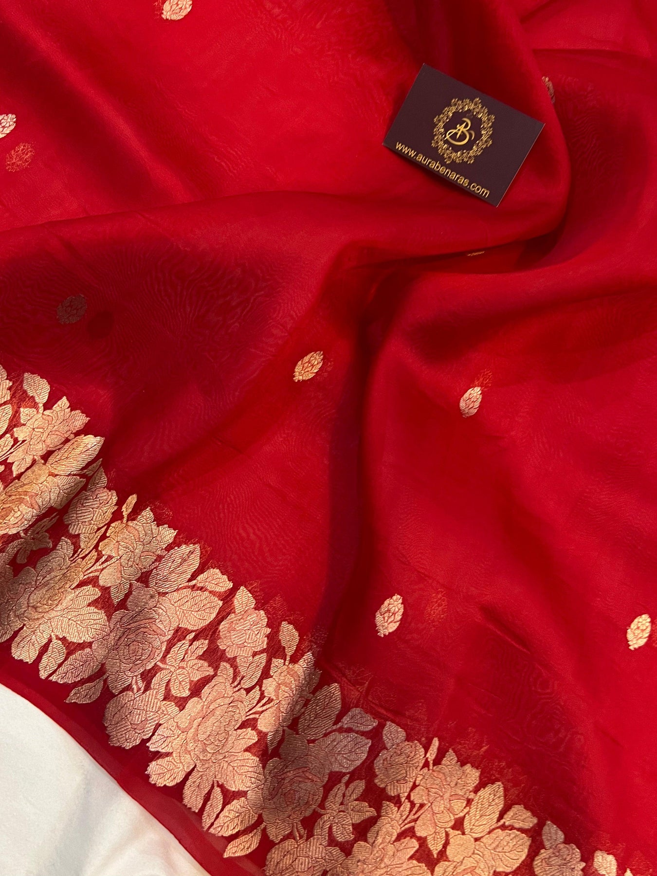 Red Banarasi Handloom Kora Silk Saree - Aura Benaras