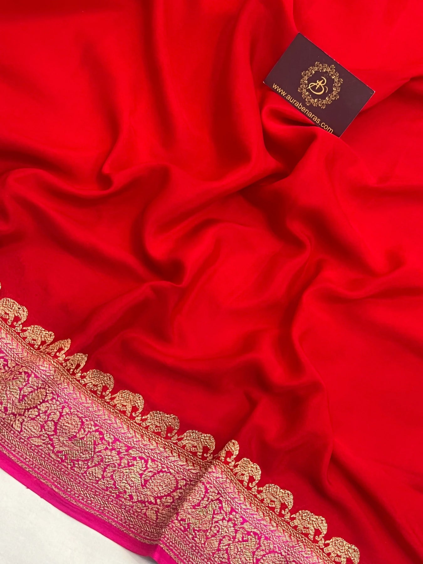 Embrace understated elegance with this Red Pure Crepe Silk Handloom Banarasi Saree, a timeless classic from the looms of Varanasi. Crafted from luxurious crepe silk, this saree features a plain body that lets the exquisite craftsmanship of the border shine. The highlight is its beautifully woven Banarasi border adorned with intricate elephant motifs in antique zari—symbolizing grace, power, and tradition.