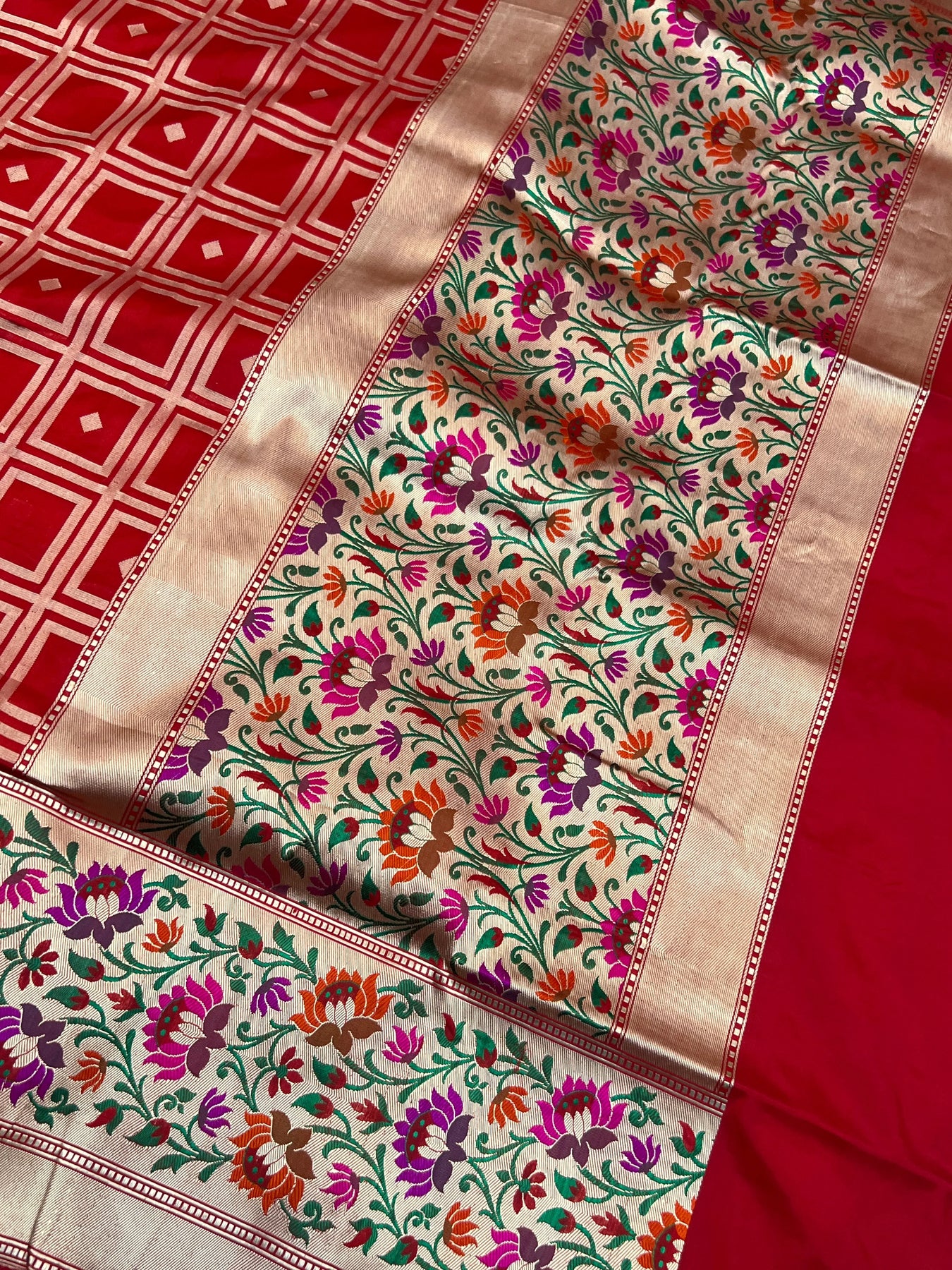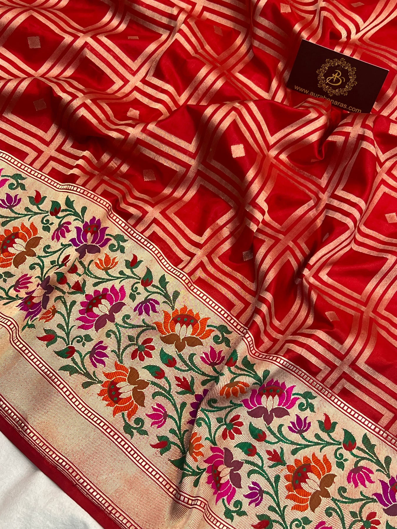 This magnificent saree is a true testament to the artistry and skill of our master weavers. Crafted in pure Katan silk, it features an exquisite allover designer jaal pattern complemented by a stunning Paithani-inspired border, showcasing the perfect blend of Banarasi and traditional craftsmanship.