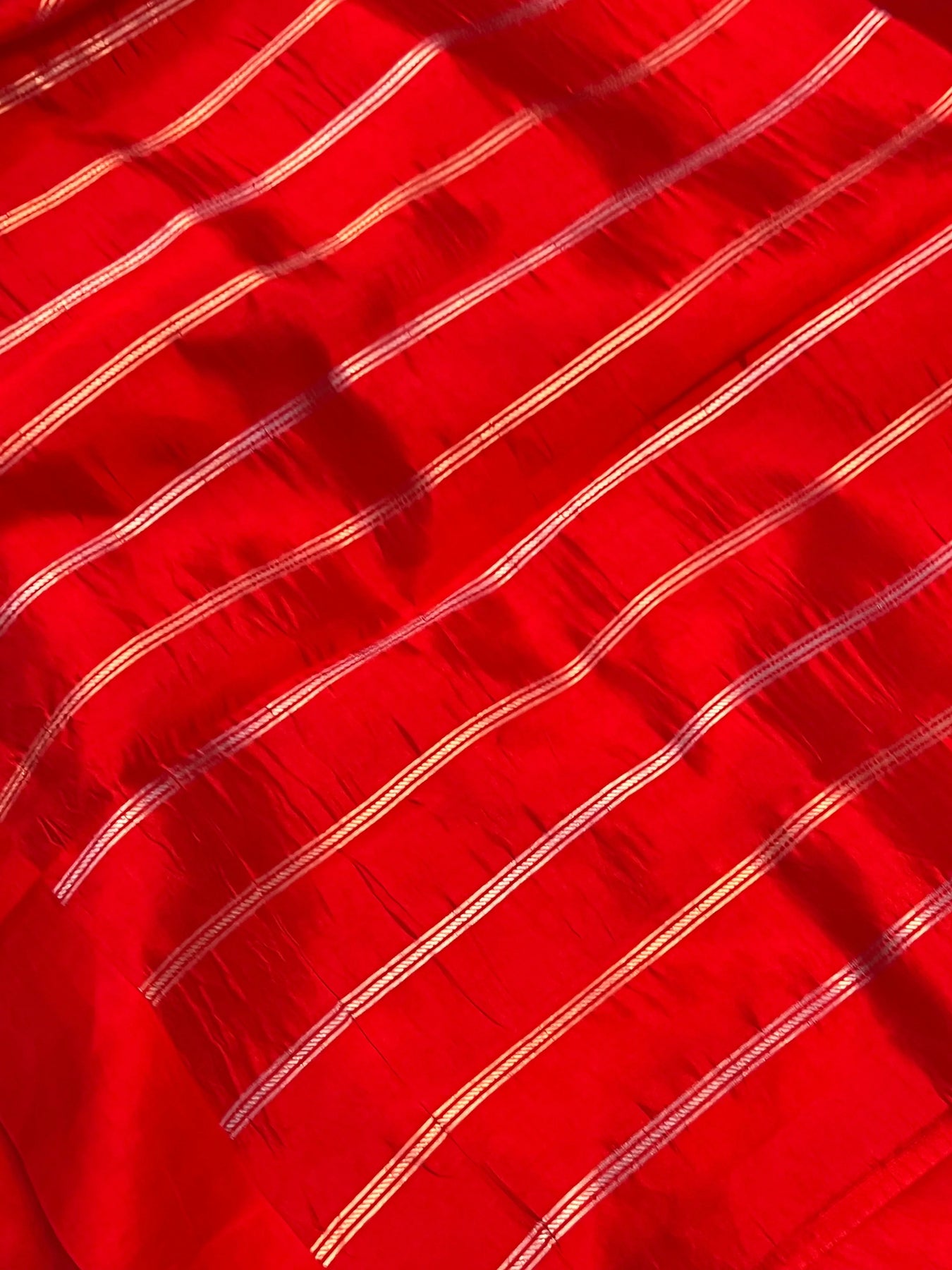 Understated yet regal, this Red pure silk handloom Banarasi saree is a timeless classic designed for effortless elegance. The body of the saree is plain, allowing the beauty of the silk’s natural sheen to shine through, while a luxurious Mashru silk border adds a rich textural contrast and traditional charm.