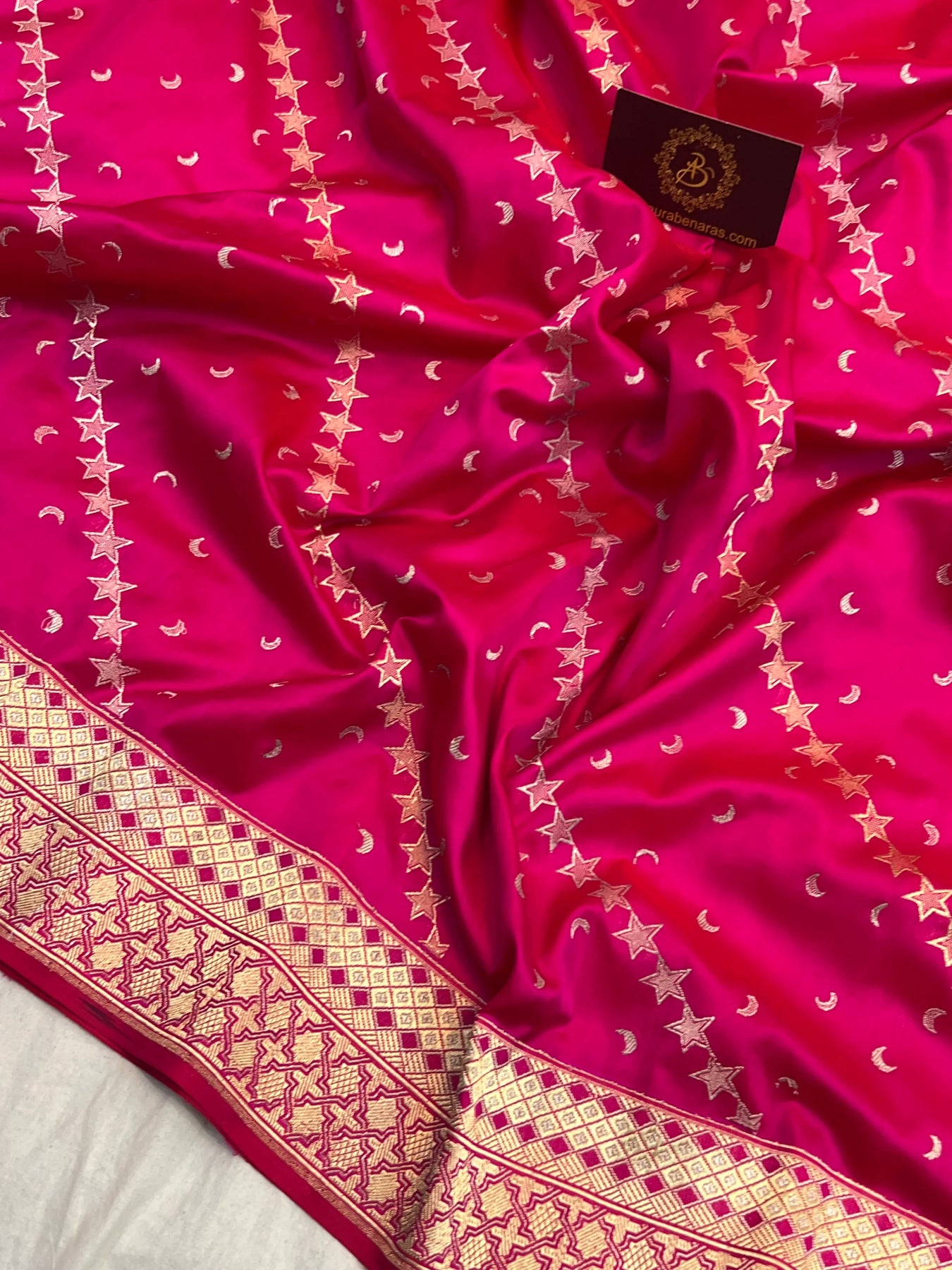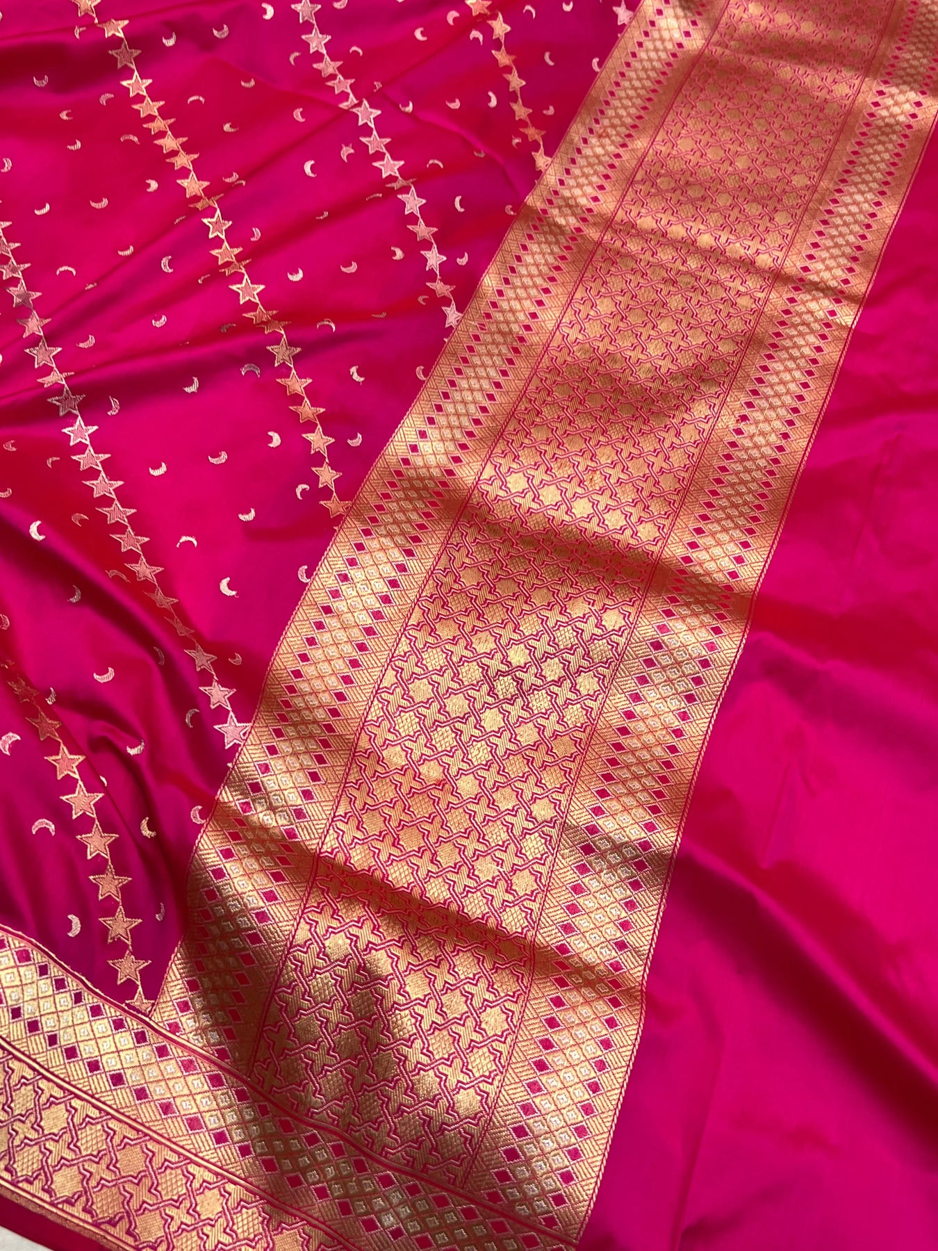 Wrap yourself in heritage with this Rani Pink Pure Katan Silk Handloom Banarasi Saree, an exquisite drape crafted with a rich Kadhwa Aada design. Adorned with alternating star and chand (moon) motifs, this saree captures the essence of traditional artistry while radiating a contemporary grace.
