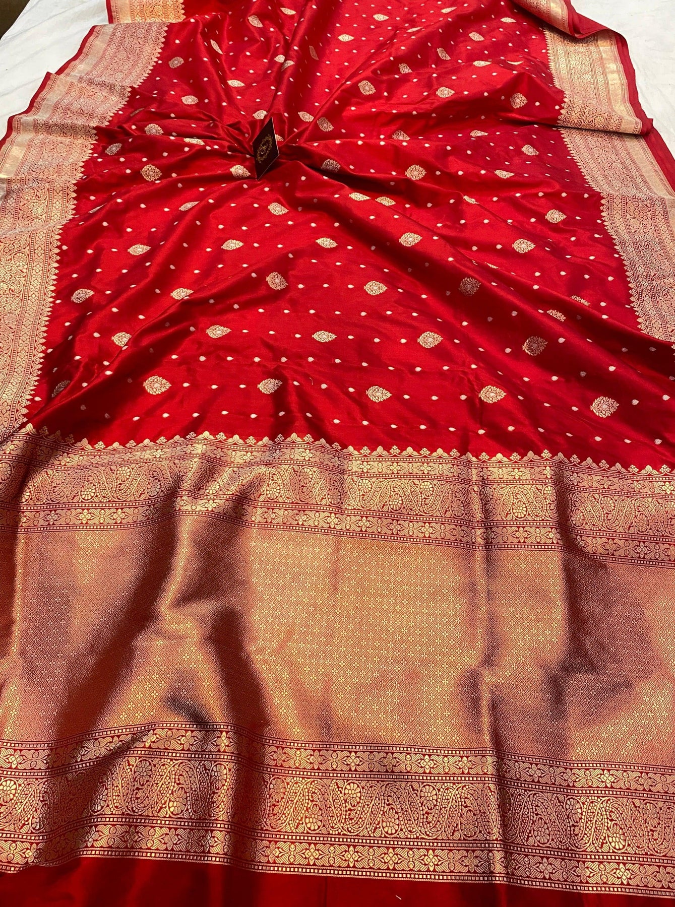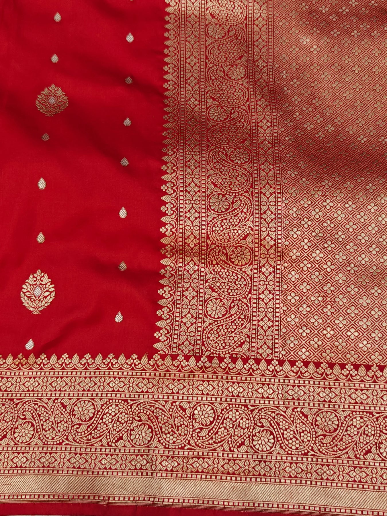 This katan silk saree brings the elegance of Banaras with it.The charm and simplicity of this red saree with beautiful border and pallu can be admired from the picture. The delicate kadhua(kadwa) buta work with gold & silver zari will make you shine with richness and love at every occasion.