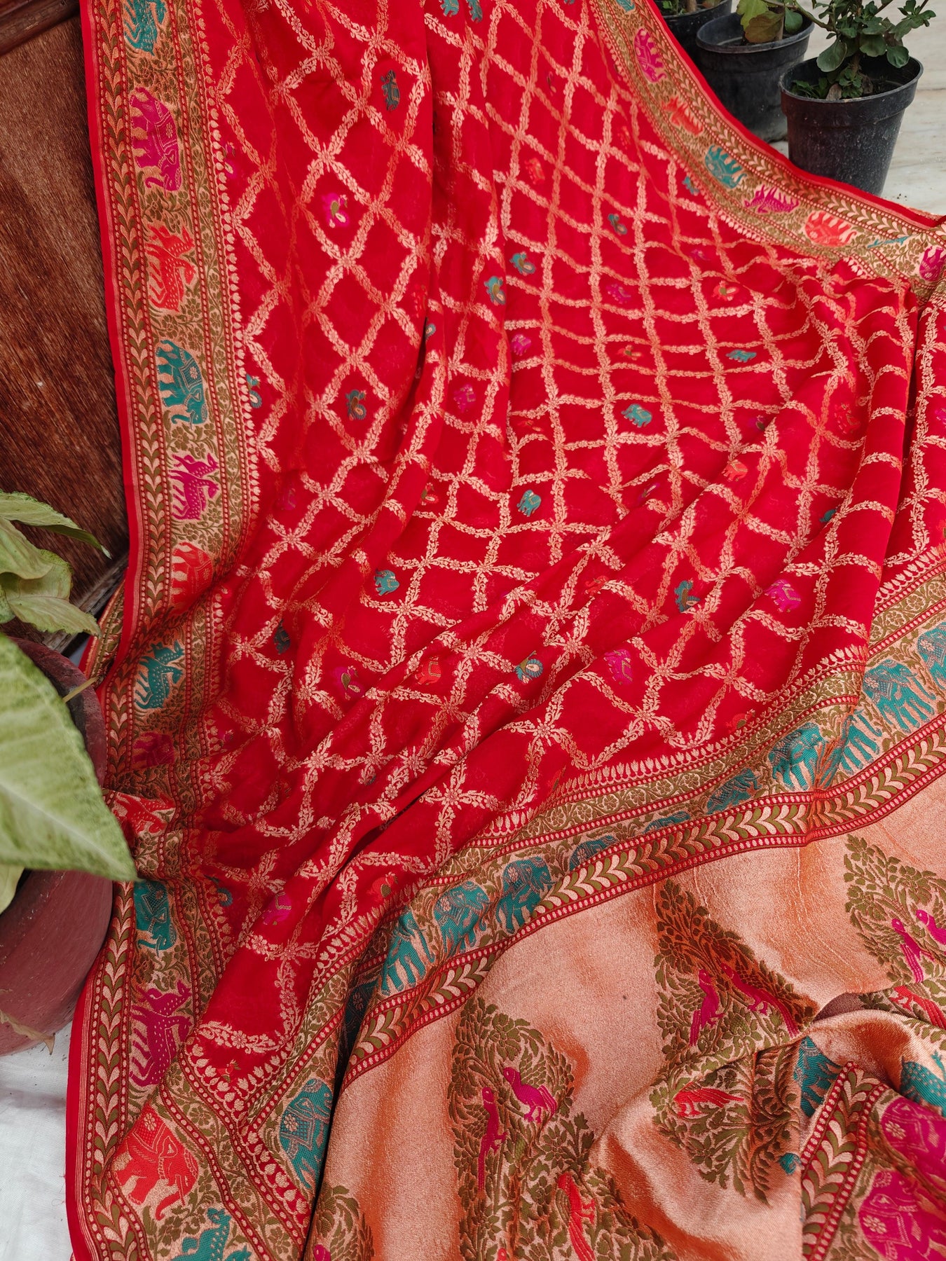 A stunning Red Banarasi handloom classic.The authentic tilfi patola jaal work with metalic gold zari handwoven in the finest chiffon georgettes, with minakari work comes with a plain blouse. It takes around 10 days to weave this rich and luxurious piece of our tradition.