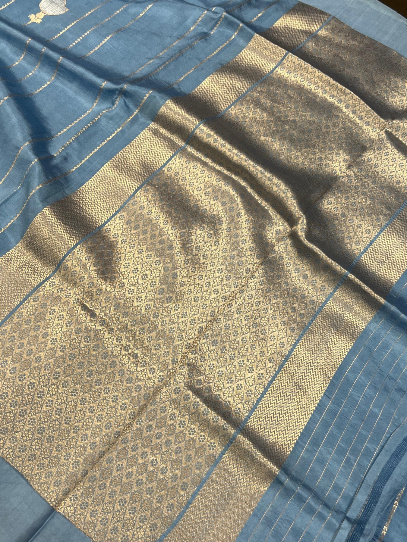 An amazing Handwoven Pure Silk in a Airforce Blue color to take your breath away. This vintage piece has an allover stripes work with Kadwa(Kadhua) sona rupa motifs in between. The plain border is beautifully woven in satin silk. The blouse piece has small motifs.
