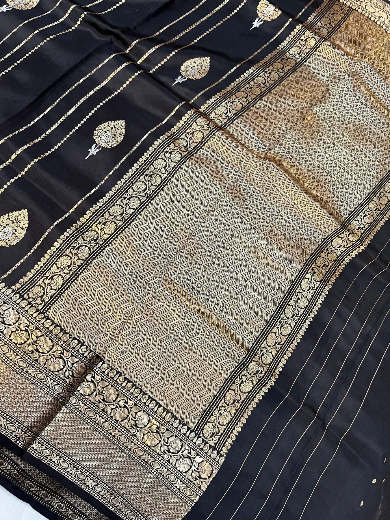 An amazing Handwoven Pure Silk in a Black color to take your breath away. This vintage piece has an allover stripes work with Kadwa(Kadhua) sona rupa motifs in between. The border is beautifully woven with golden zari work. The blouse piece has small motifs.