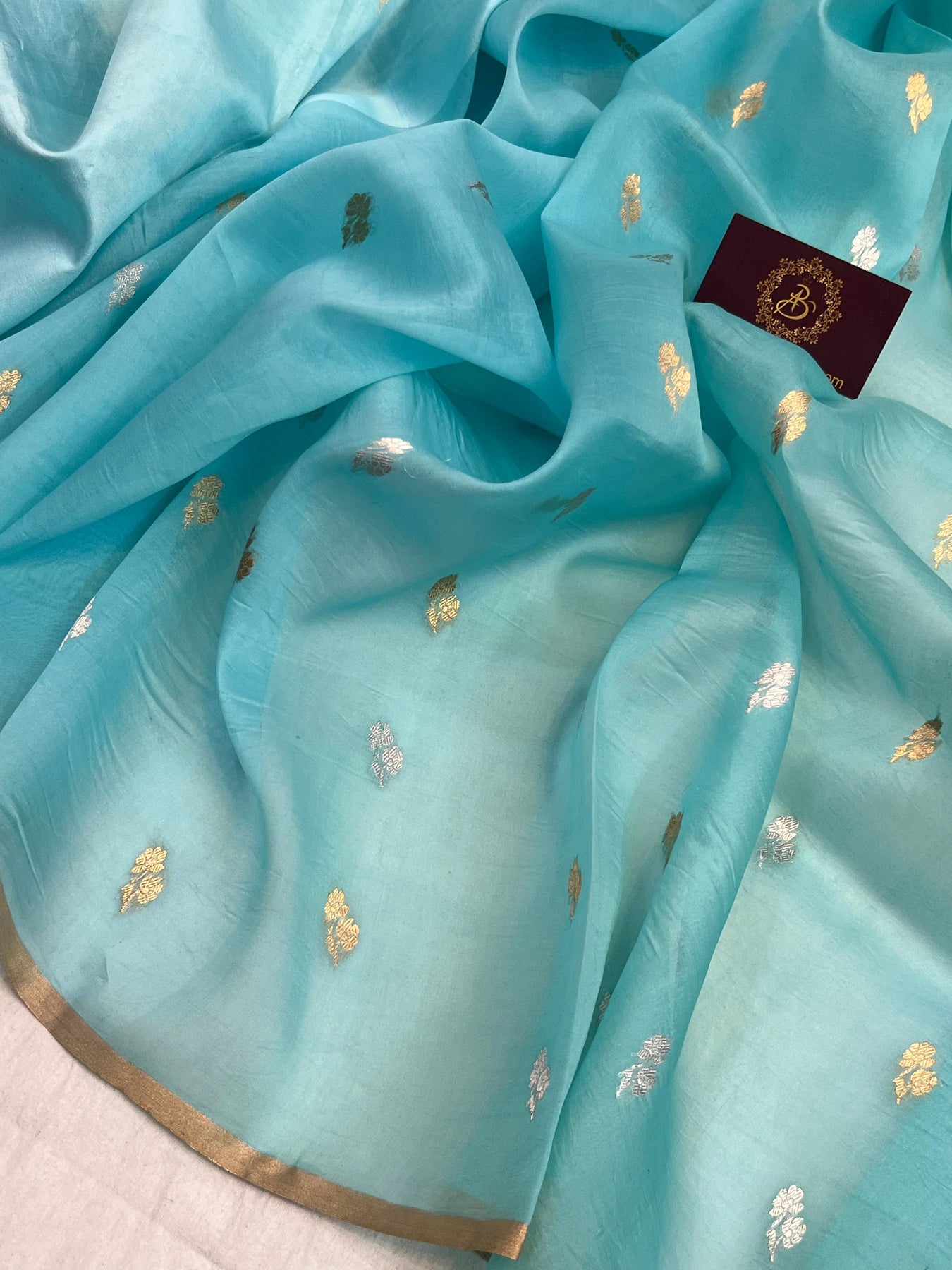 Experience the finest of Banarasi craftsmanship with this exquisite pure handloom Banarasi saree, featuring intricate Kadhwa Sona Rupa butis and a delicate zari selvage. This exceptional piece is woven in a rare combination of three luxurious fabrics—the rich pallu in shimmering tissue silk, the segment near the pallu in sheer and elegant kora silk, and the inner body in smooth pure silk for a graceful drape. The artistry is further enhanced with a striped pure silk blouse piece, making this saree a true confluence of tradition and innovation. Perfect for weddings, festive occasions, or heirloom collections.