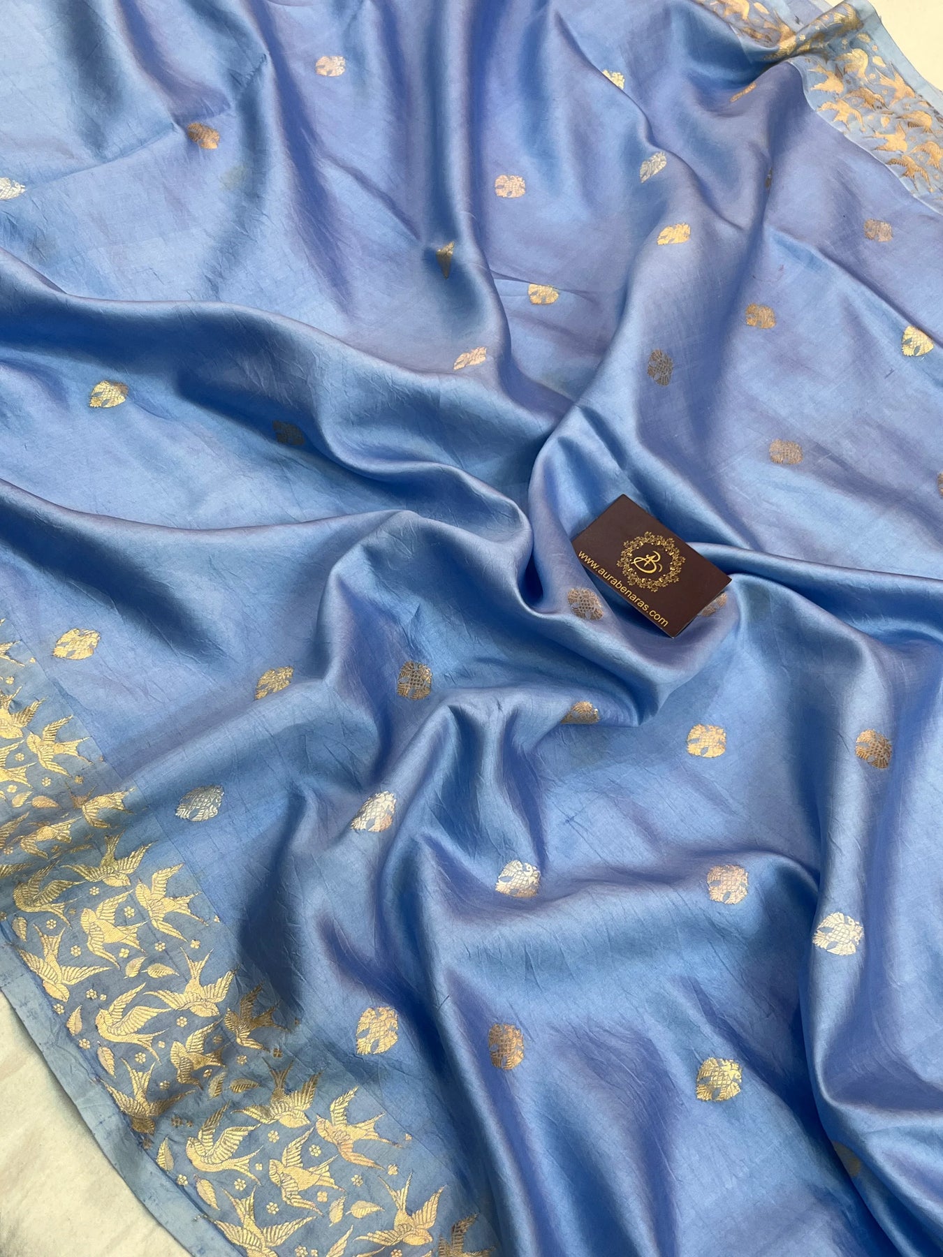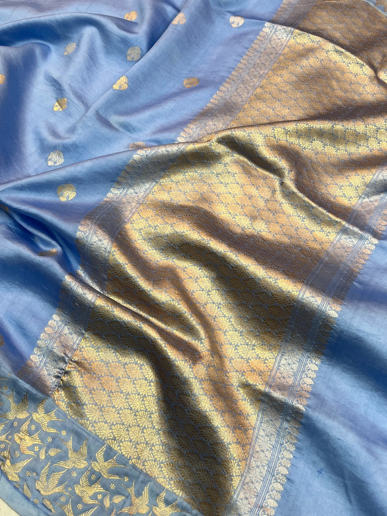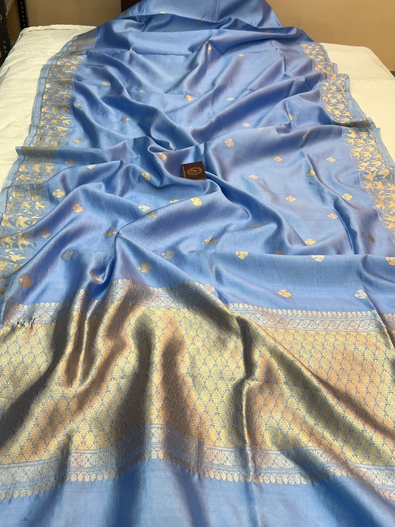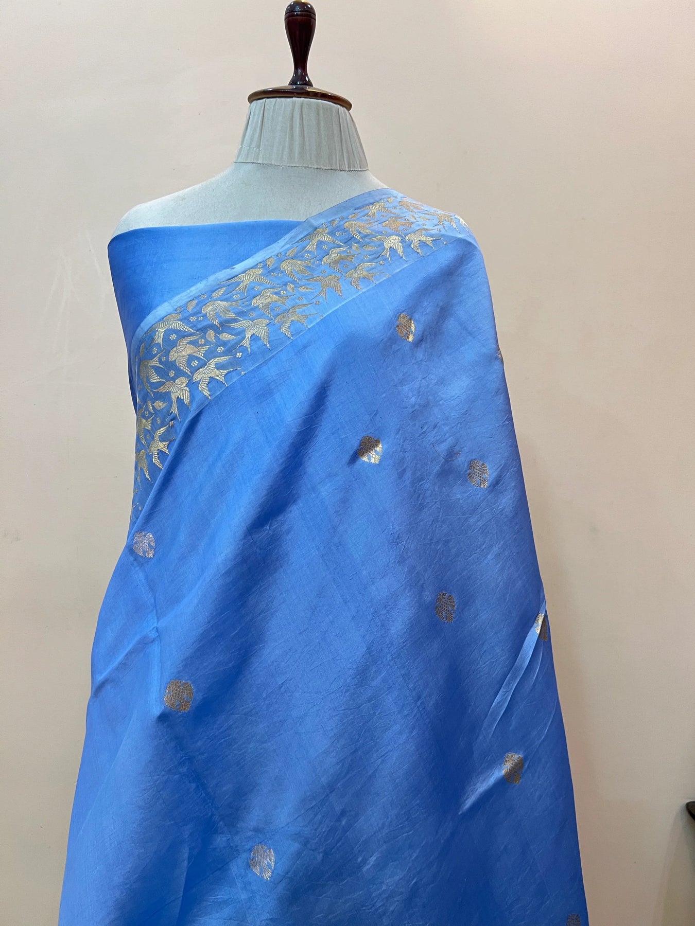 Immerse yourself in the charm of heritage with this Blue Pure Silk Handloom Banarasi Saree, meticulously woven with delicate Kadhwa butis using fine golden zari. The highlight of this masterpiece is its exquisite designer Banarasi border, adorned with intricately woven bird motifs that add a whimsical yet regal touch. Crafted from the finest silk in Varanasi, the saree drapes gracefully, making it a perfect pick for festive occasions, weddings, or elegant gatherings. It comes with a plain blouse piece with a matching border, ensuring timeless sophistication in every detail.