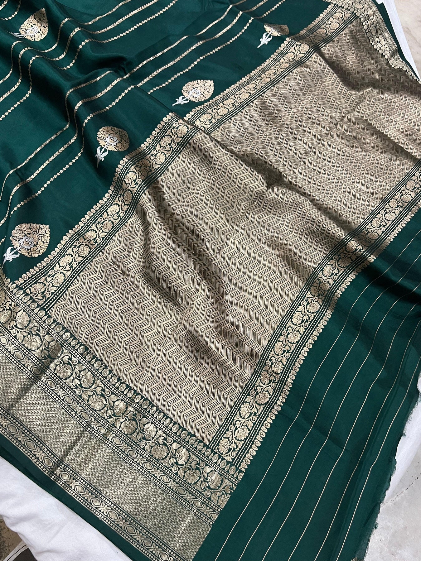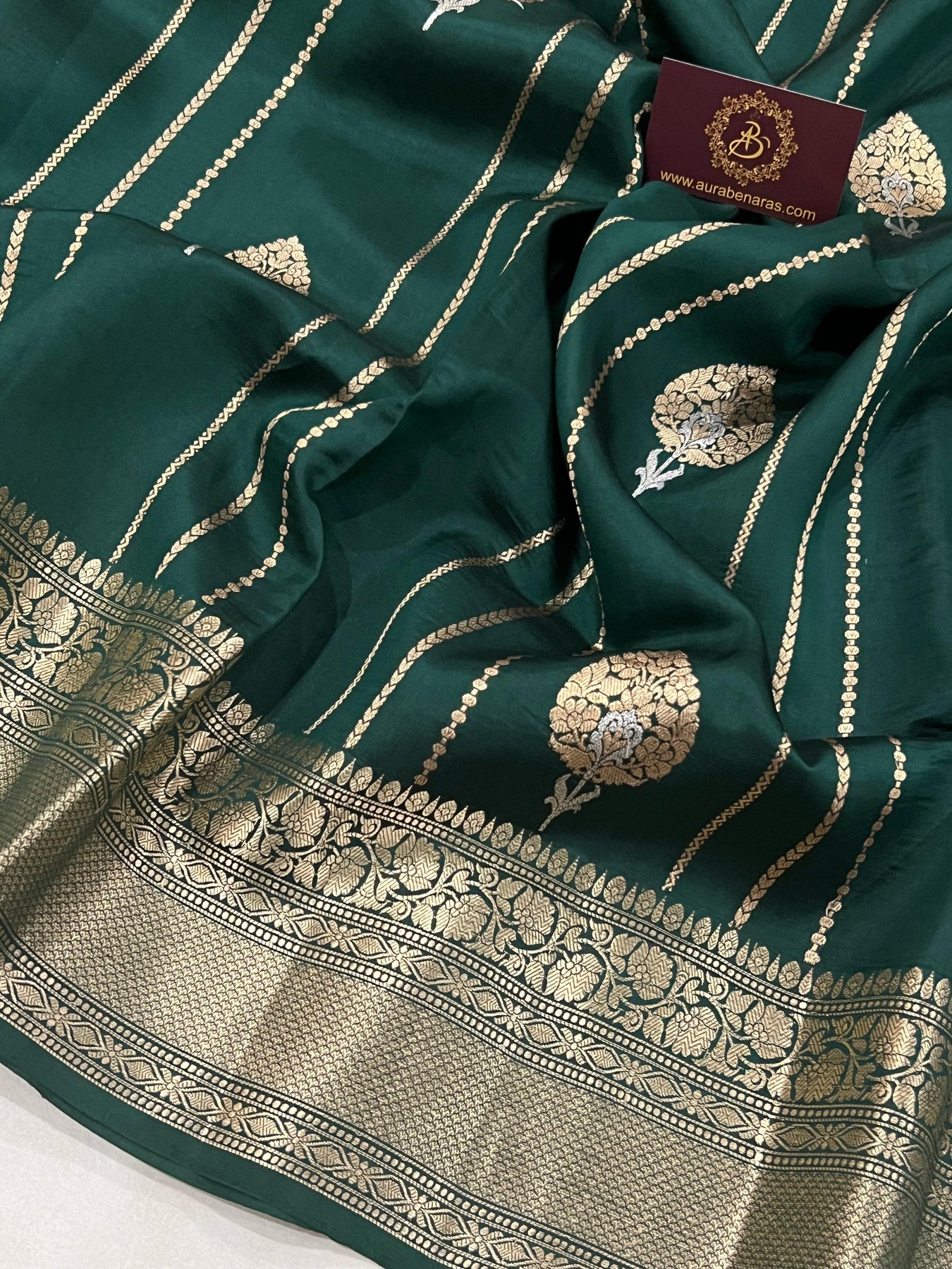 Bottle Green Pure Banarasi Handloom Silk Saree - Aura Benaras