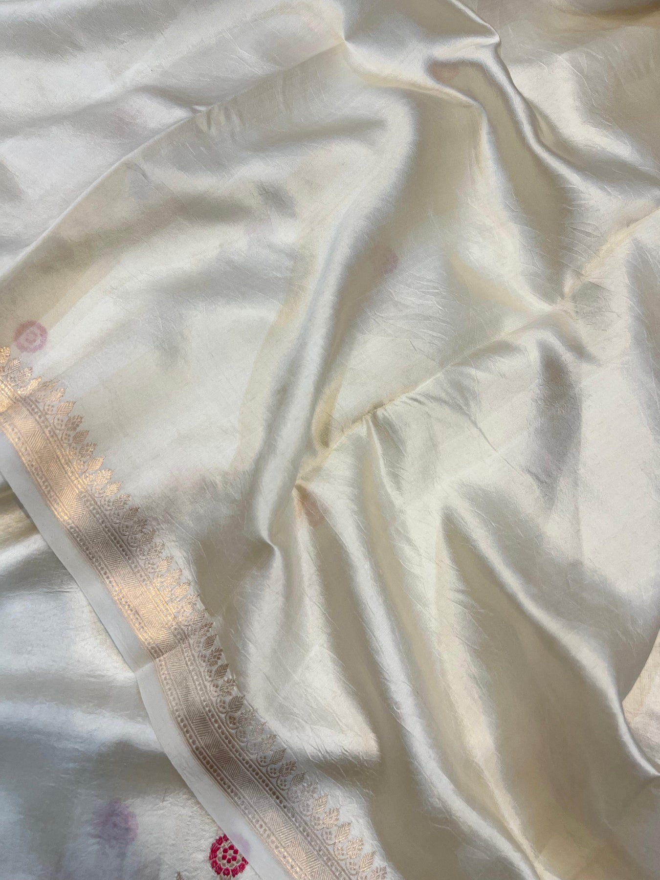 The pure Banarasi silk saree is a stunning representation of traditional craftsmanship and luxurious elegance. Adorned with intricate kadhwa meena motifs, the saree features a rich interplay of golden zari and meena work that create a beautiful shimmer, reminiscent of the glow of precious metals.