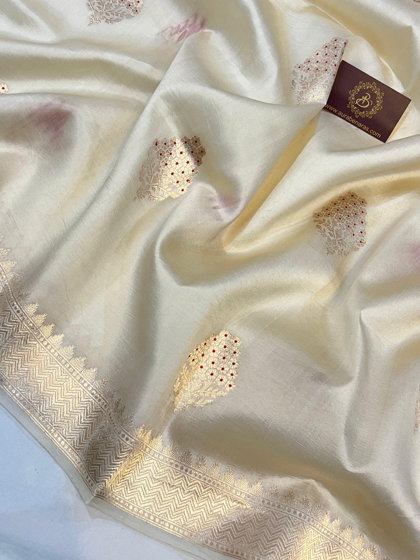 An amazing Handwoven silk saree in a Cream color to take your breath away. This vintage piece has Kadwa(Kadhua) floral motifs with meenakari work all over the saree. It has a kadhwa banarasi border with golden zari. Blouse piece is plain with border. It takes around 15-20 days for artisans to weave one.
