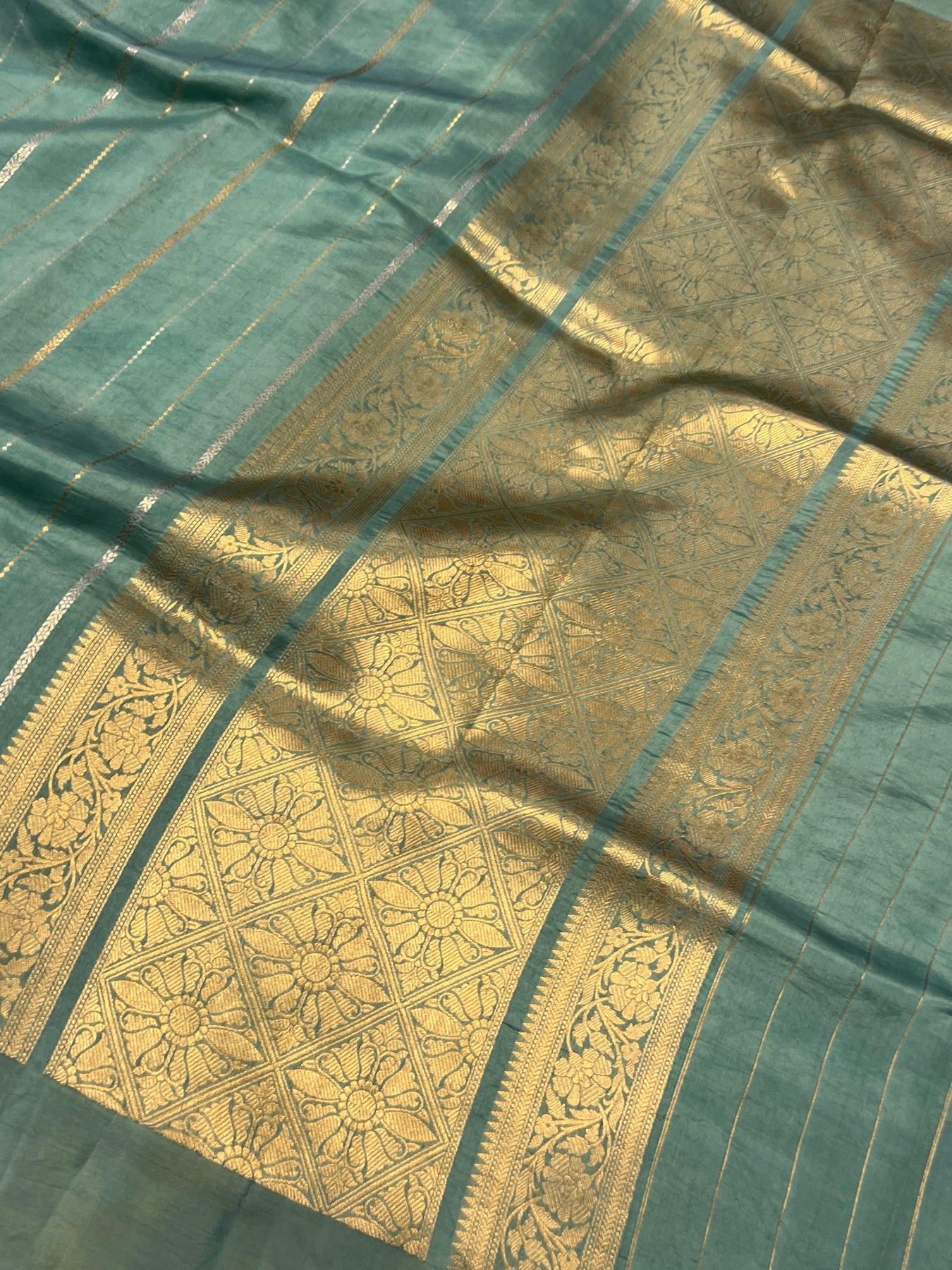 An amazing Handwoven Pure Silk in a Greyish Green color to take your breath away. This vintage piece has an allover stripes golden and silver zari stripes. The plain border is beautifully woven in satin silk. The blouse piece has small motifs.