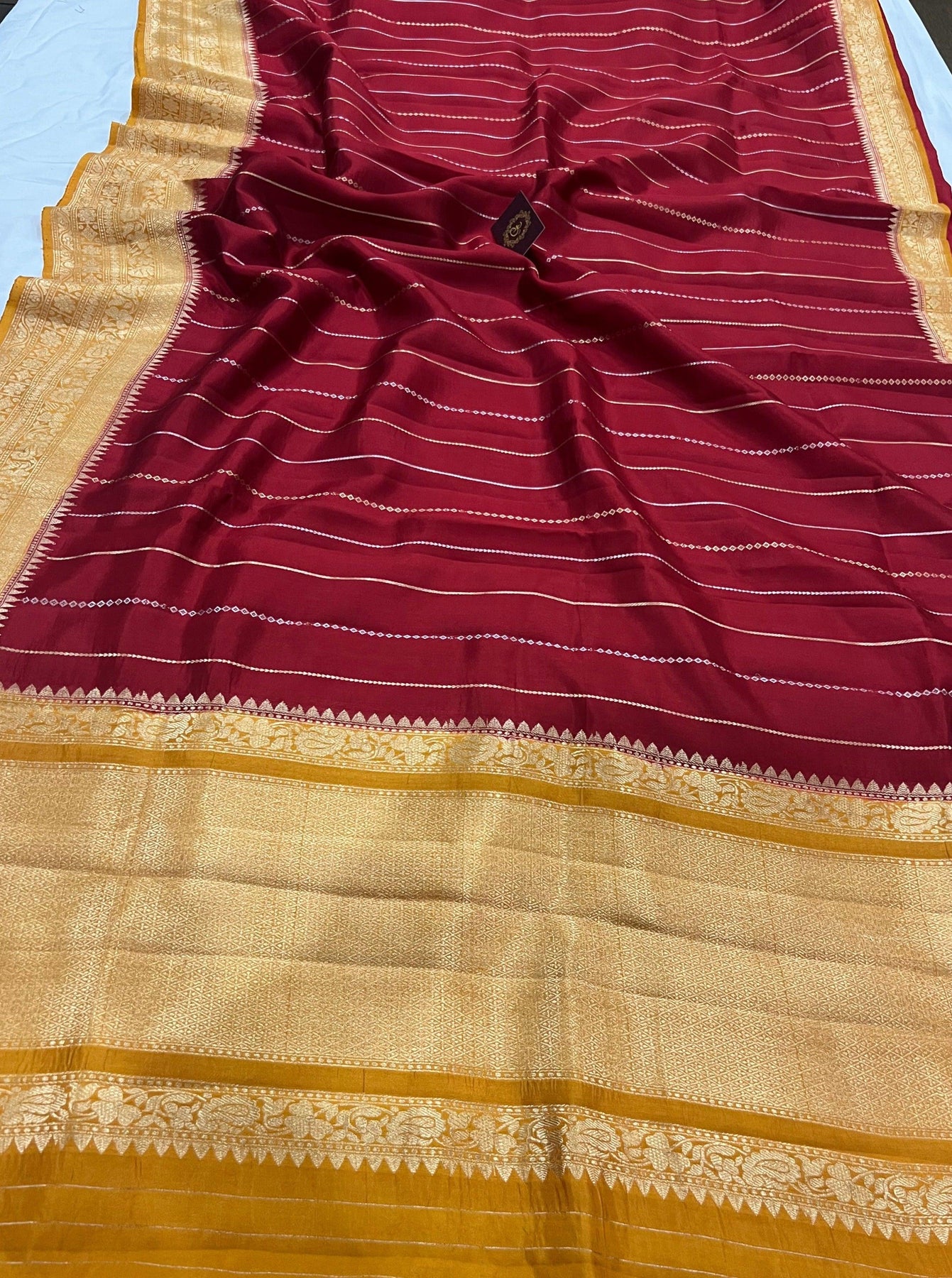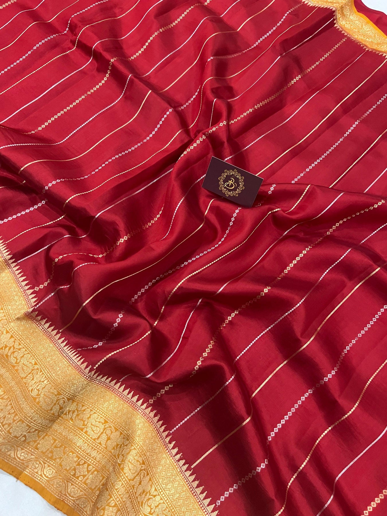 An amazing Handwoven Pure Silk in a Maroon color to take your breath away. This vintage piece has an allover stripes work with Kadwa(Kadhua) sona rupa motifs in between. The border is beautifully woven with golden zari work. The blouse piece has small motifs.