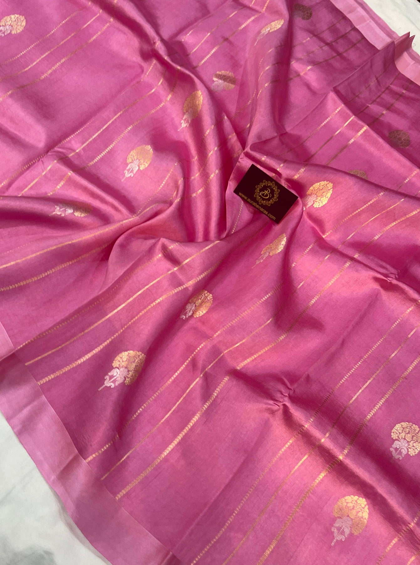 An amazing Handwoven Pure Silk in a Mauve color to take your breath away. This vintage piece has an allover stripes work with Kadwa(Kadhua) sona rupa motifs in between. The plain border is beautifully woven in satin silk. The blouse piece has small motifs.
