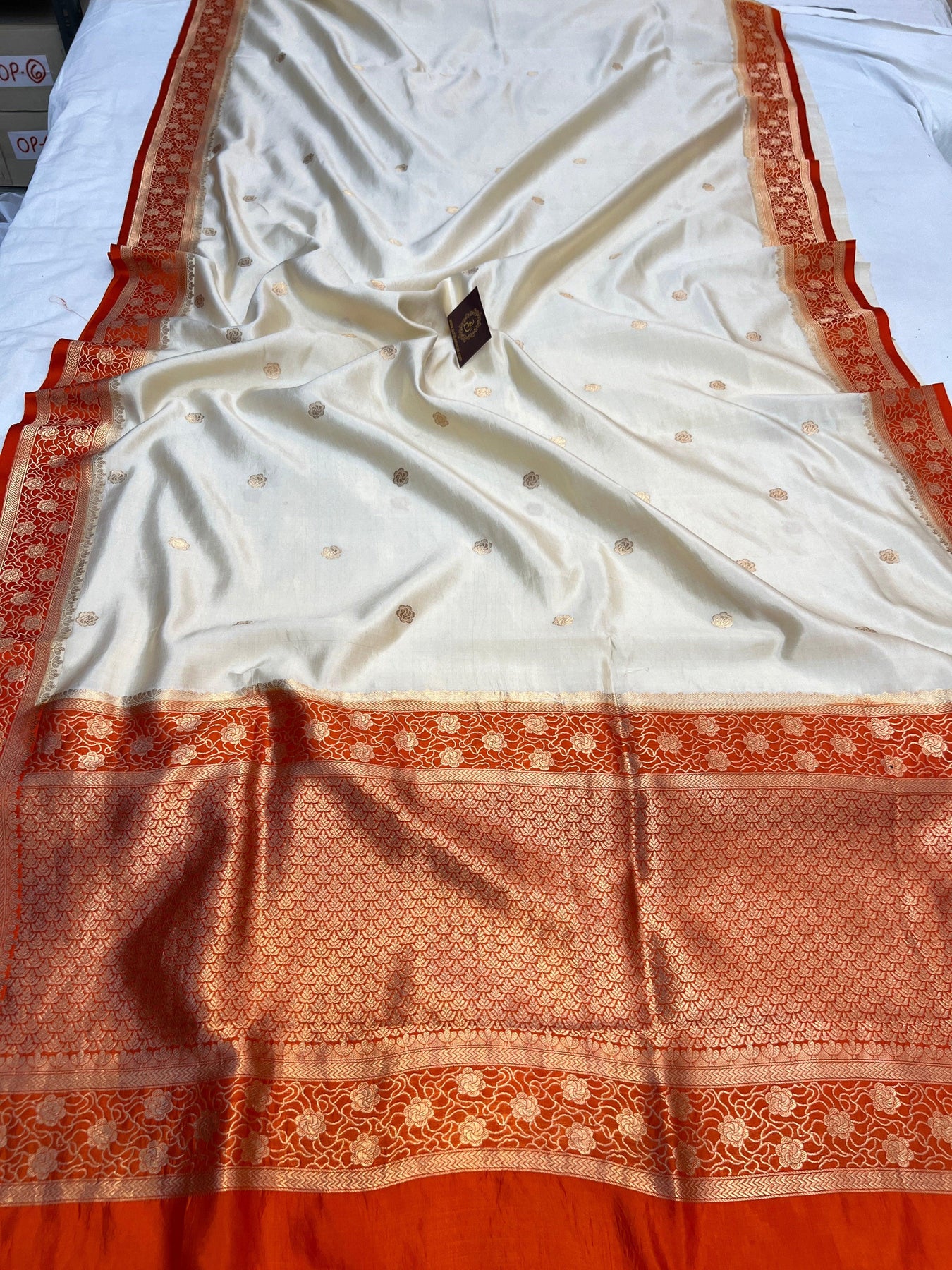 Timeless elegance takes form in this stunning off-white pure Banarasi silk saree, a masterpiece of traditional Indian weaving. Handcrafted in the legendary looms of Varanasi, this saree features intricate Kadhwa butis woven in golden zari, reflecting the finesse of the Kadhwa technique—where each motif is individually woven without any floats at the back.