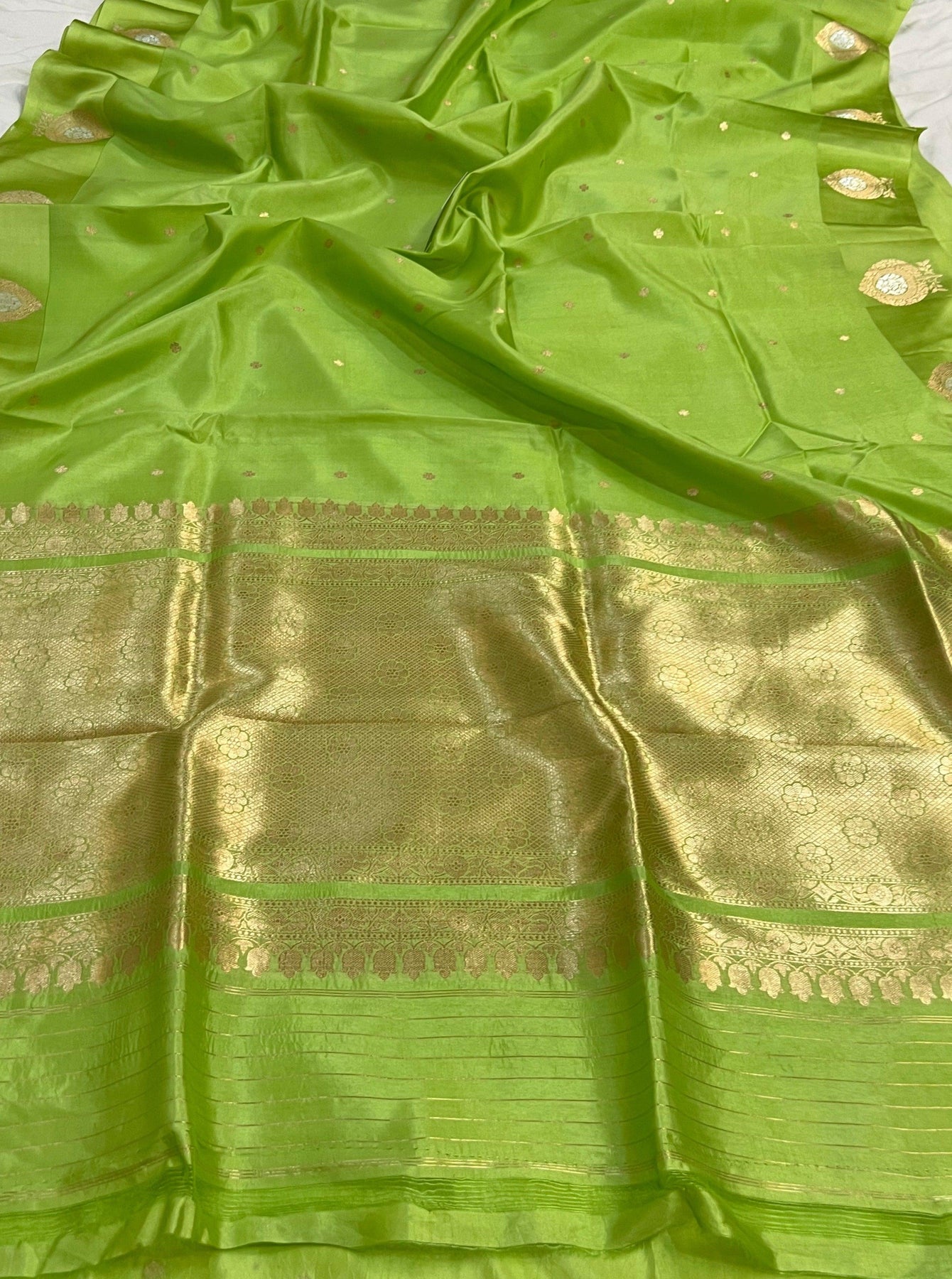 An amazing Handwoven Pure Silk in a Pista Green color to take your breath away. This vintage piece has an allover Kadwa(Kadhua) motifs in golden zari. The border is beautifully woven in satin silk with kadhwa sona and rupa motifs. It comes with a plain blouse piece.