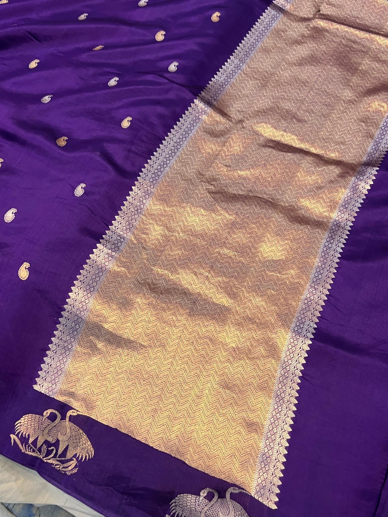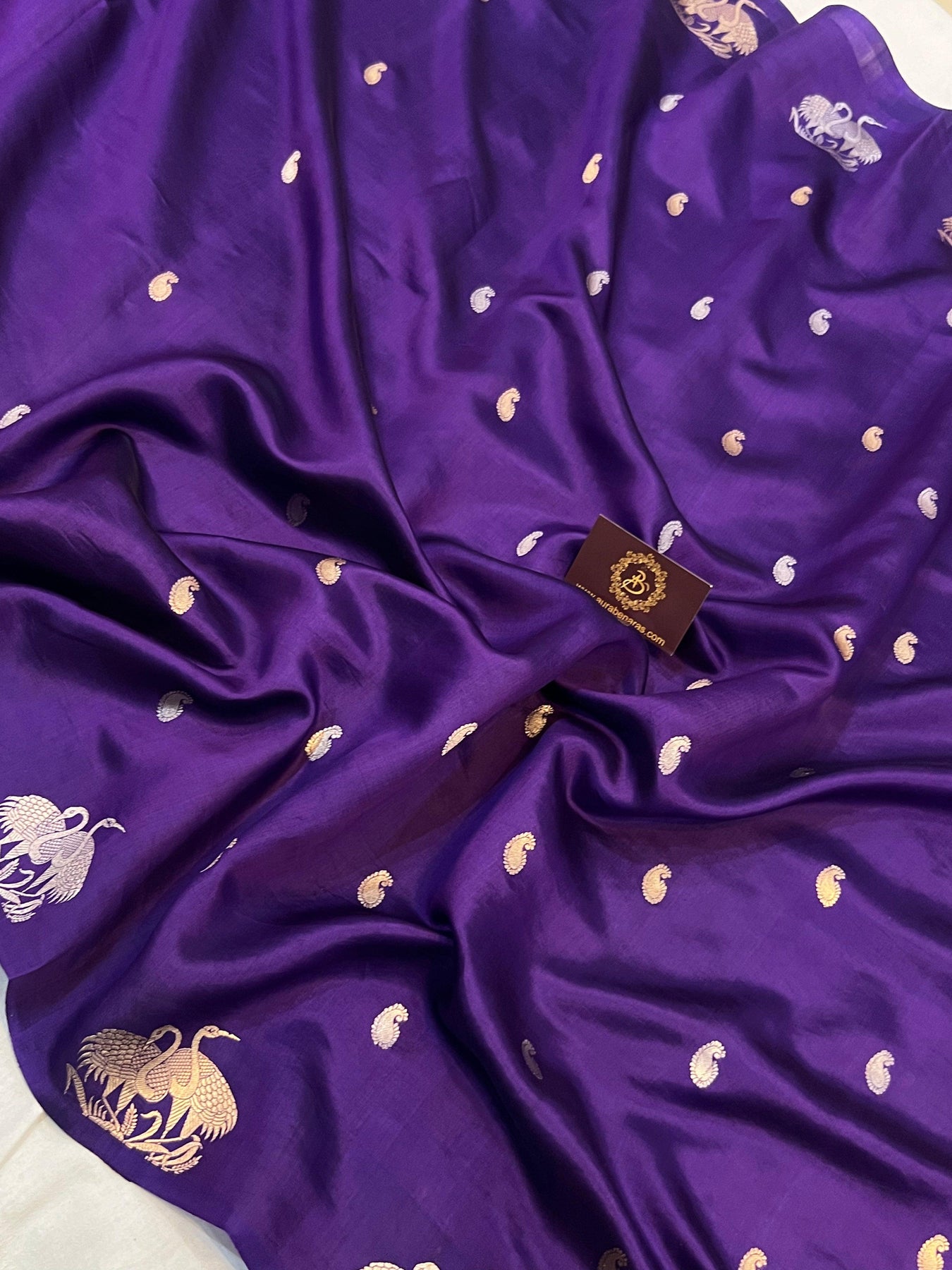 This pure Banarasi handloom silk saree features intricate allover kadhwa motifs, adding a rich, textured elegance to the fabric. The saree is bordered with a striking silk border, adorned with unique kadhwa animal motifs, bringing a distinct touch of artistry and nature-inspired design. The blouse piece is plain, offering a subtle, refined complement to the saree's detailed beauty.