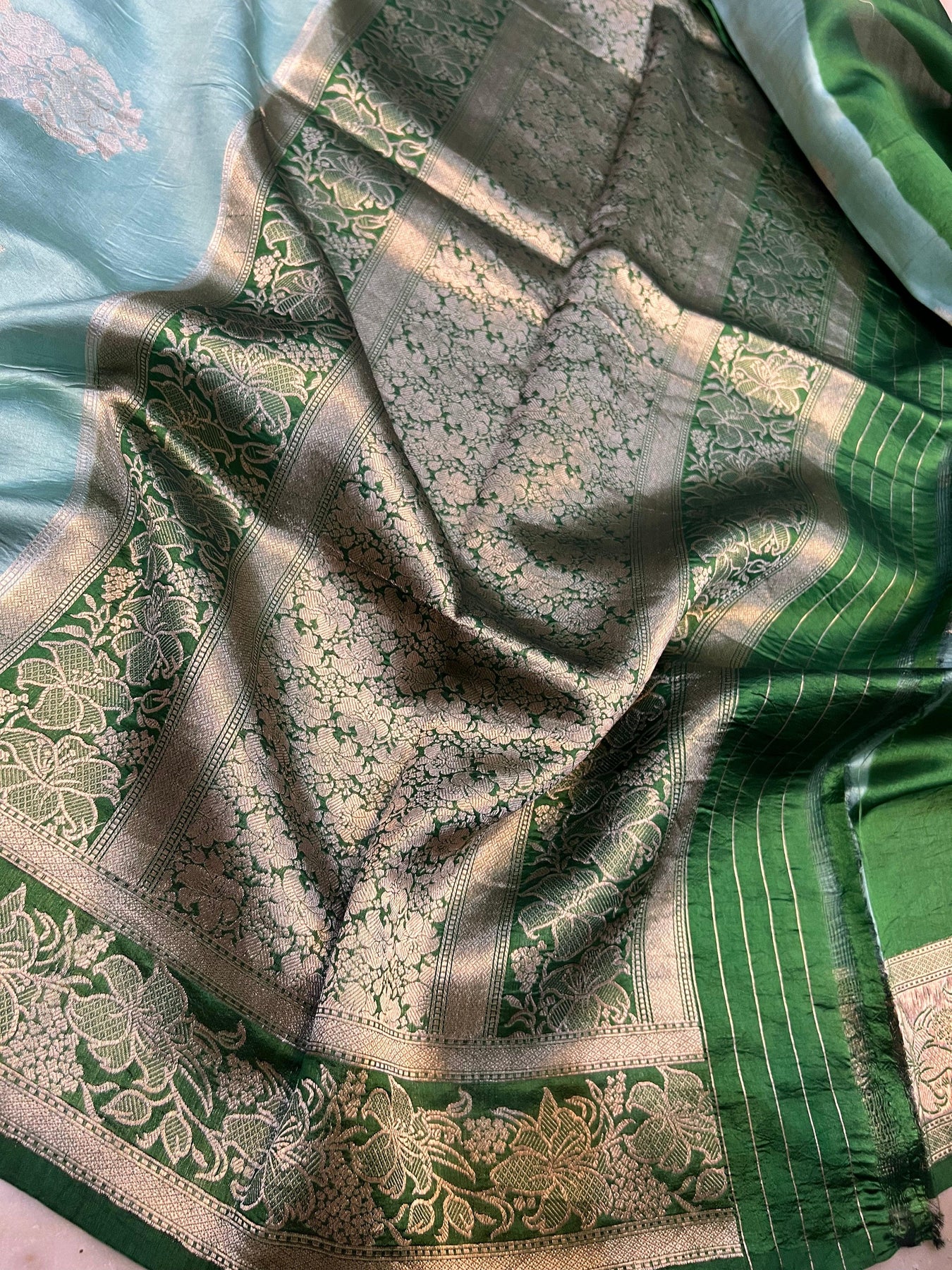 - Color - Sage Green Banarasi saree with dark green contrast.