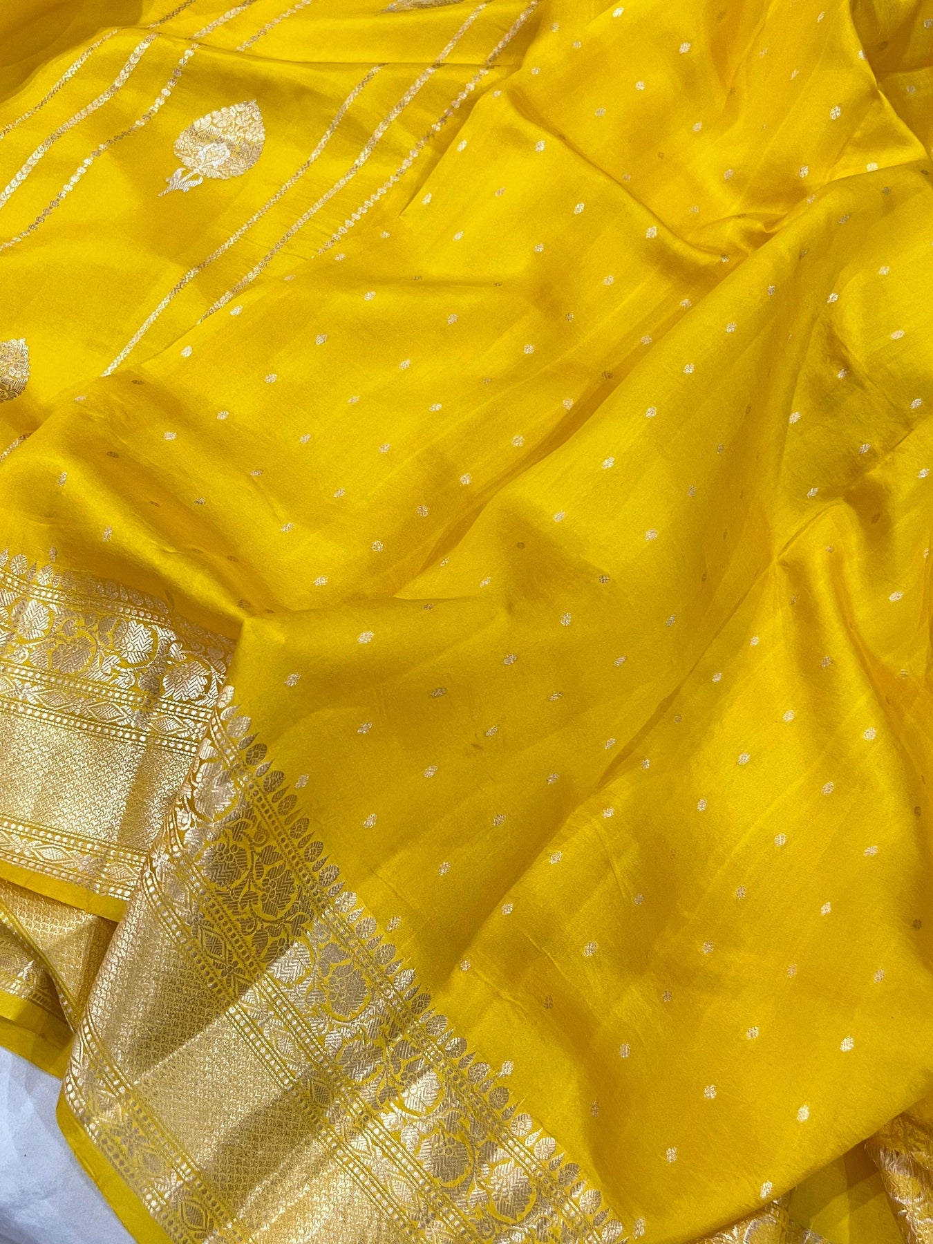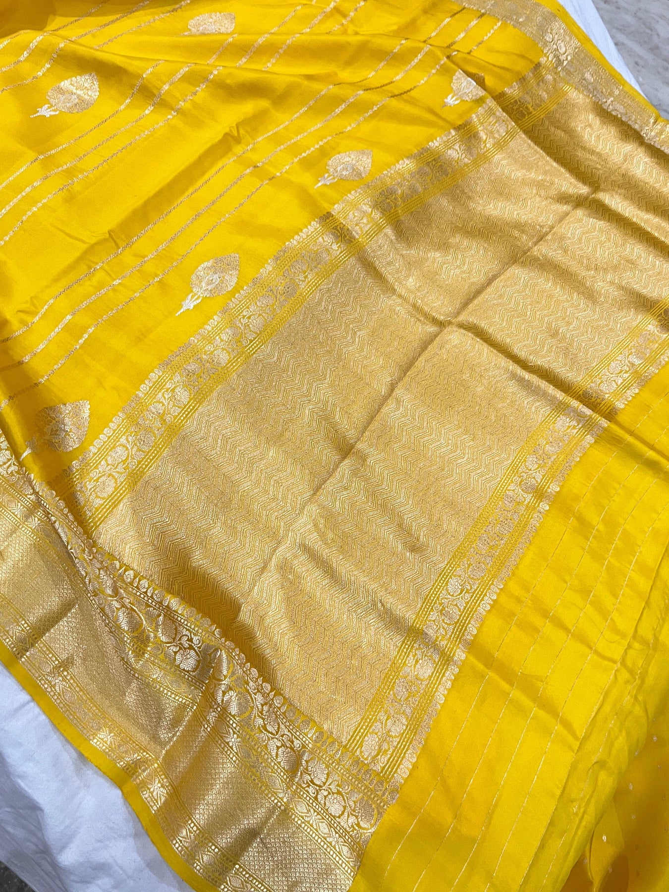 An amazing Handwoven Pure Silk in a Yellow color to take your breath away. This vintage piece has an allover stripes work with Kadwa(Kadhua) sona rupa motifs in between. The border is beautifully woven with golden zari work. The blouse piece has small motifs.