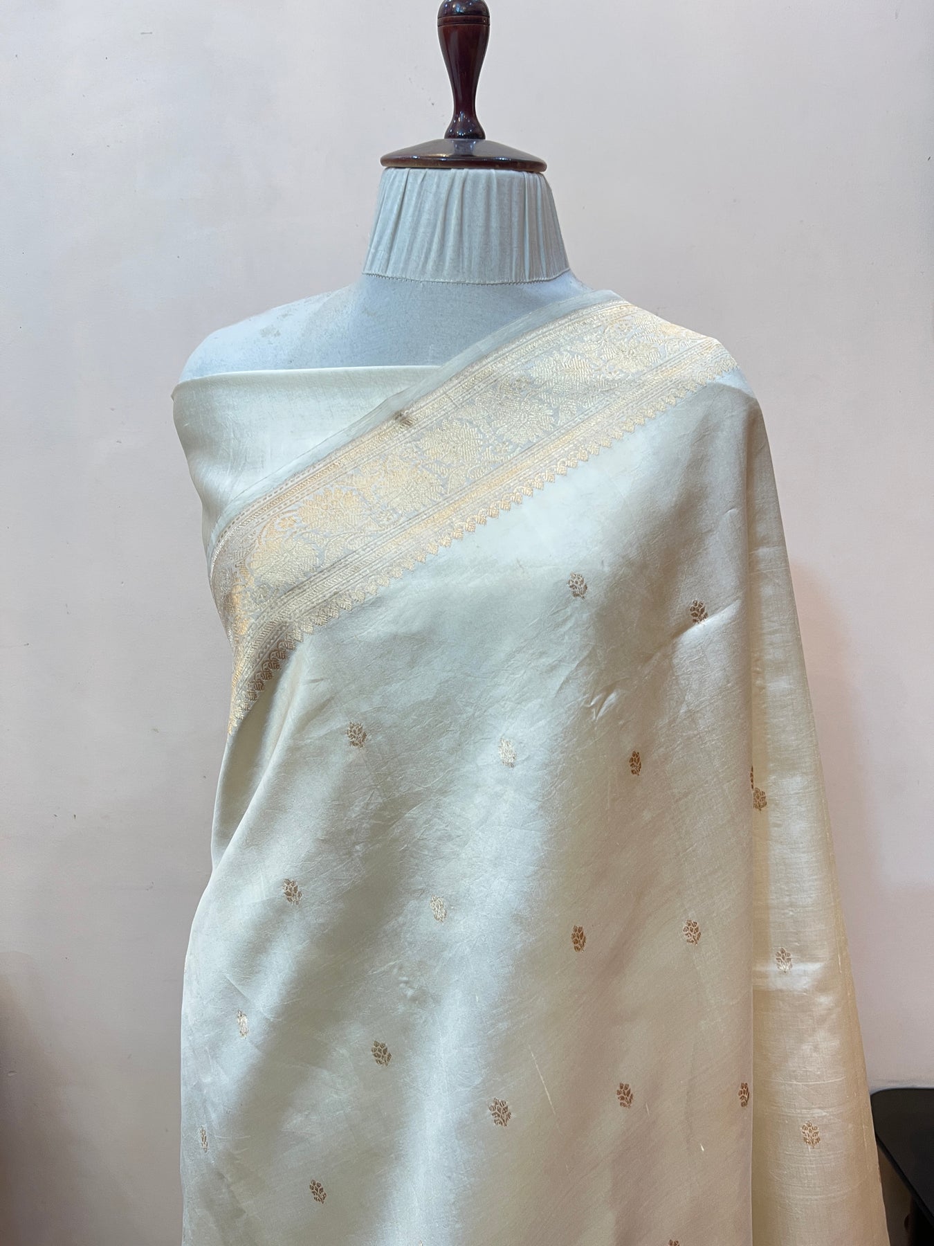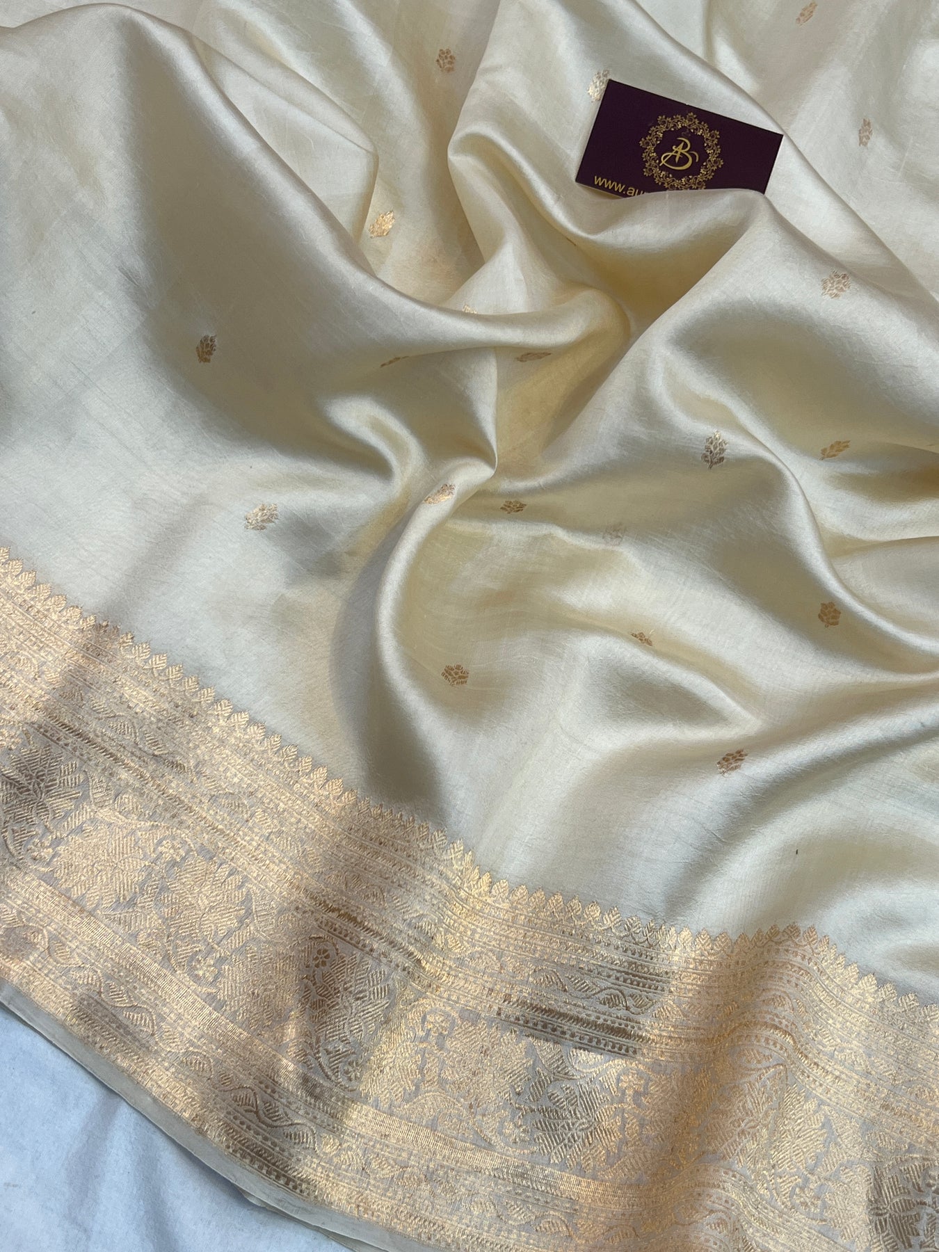 Immerse yourself in timeless elegance with this Cream Pure Silk Handloom Banarasi Saree, exquisitely woven with traditional Kadhwa butis in golden zari. The luxurious pure silk drapes gracefully, showcasing the finesse of handloom craftsmanship from Banaras. A classic Banarasi border, intricately detailed in zari, frames the saree beautifully and adds to its regal appeal. Paired with a plain blouse piece enhanced with a matching border, this saree is an ideal choice for weddings, festive occasions, and cultural celebrations. A true testament to heritage and artisanal mastery.