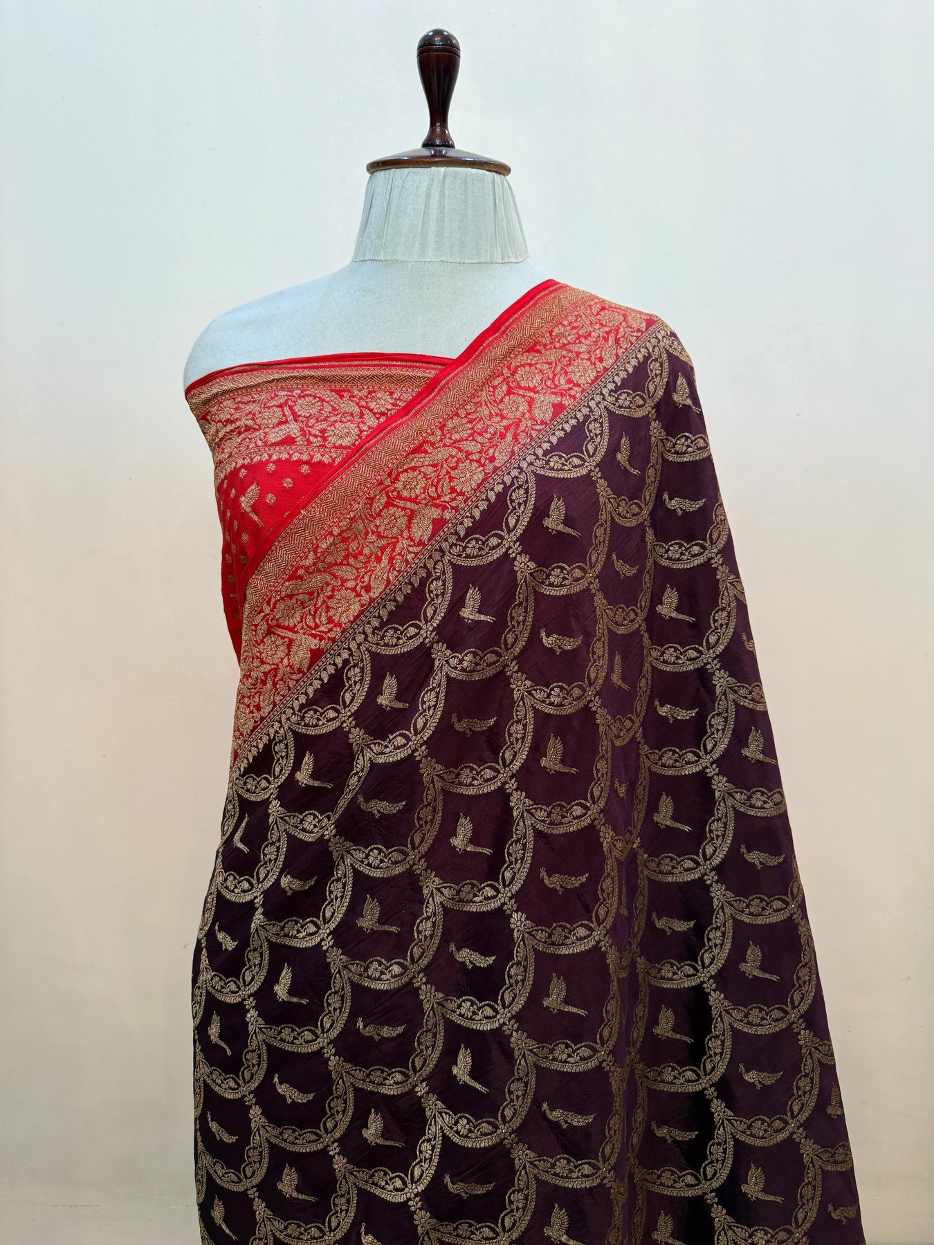 - Color - Brown Banarasi saree with Red contrast Border.