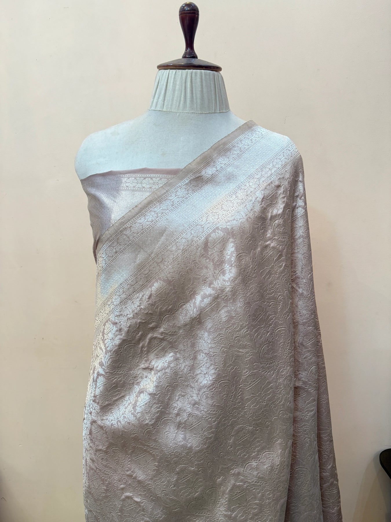 Immerse yourself in timeless elegance with this Beige pure Katan silk handloom Banarasi saree, masterfully adorned with exquisite allover brocade work. The saree features a beautiful and intricate floral design that celebrates the heritage of Banarasi craftsmanship, adding a touch of luxury and sophistication. The highlight of this masterpiece is its rich and opulent pallu, designed to create a regal and captivating look that’s perfect for weddings, festive occasions, and grand celebrations. Paired with a plain blouse piece for a refined balance, this Banarasi saree is a celebration of tradition and elegance that never goes out of style.