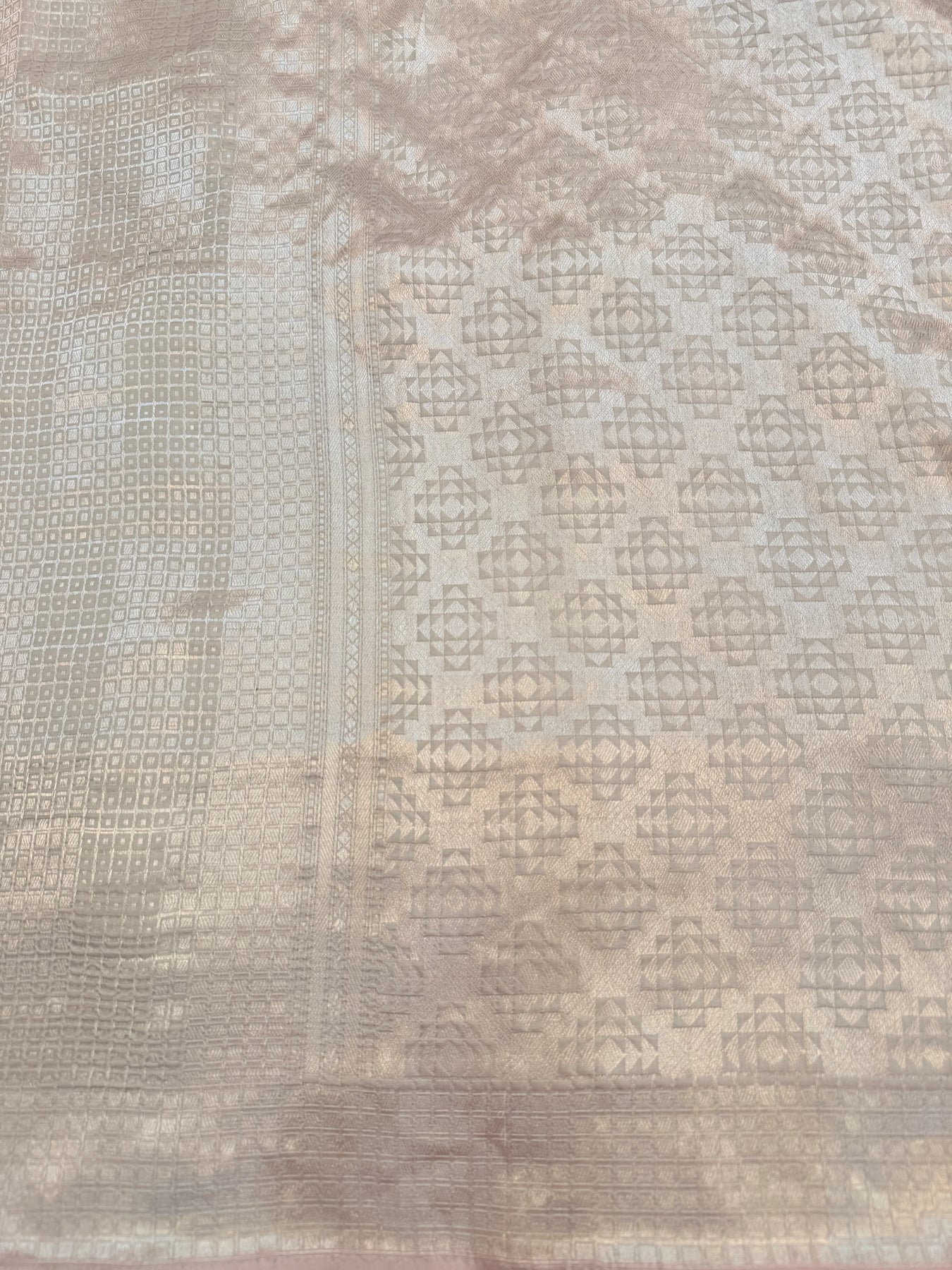 Immerse yourself in timeless elegance with this Beige pure Katan silk handloom Banarasi saree, masterfully adorned with exquisite allover brocade work. The saree features a beautiful and intricate floral design that celebrates the heritage of Banarasi craftsmanship, adding a touch of luxury and sophistication. The highlight of this masterpiece is its rich and opulent pallu, designed to create a regal and captivating look that’s perfect for weddings, festive occasions, and grand celebrations. Paired with a plain blouse piece for a refined balance, this Banarasi saree is a celebration of tradition and elegance that never goes out of style.