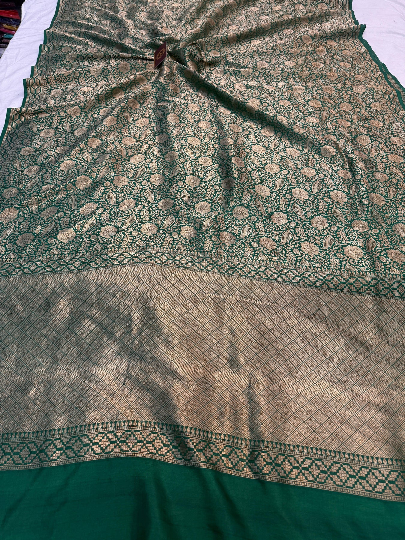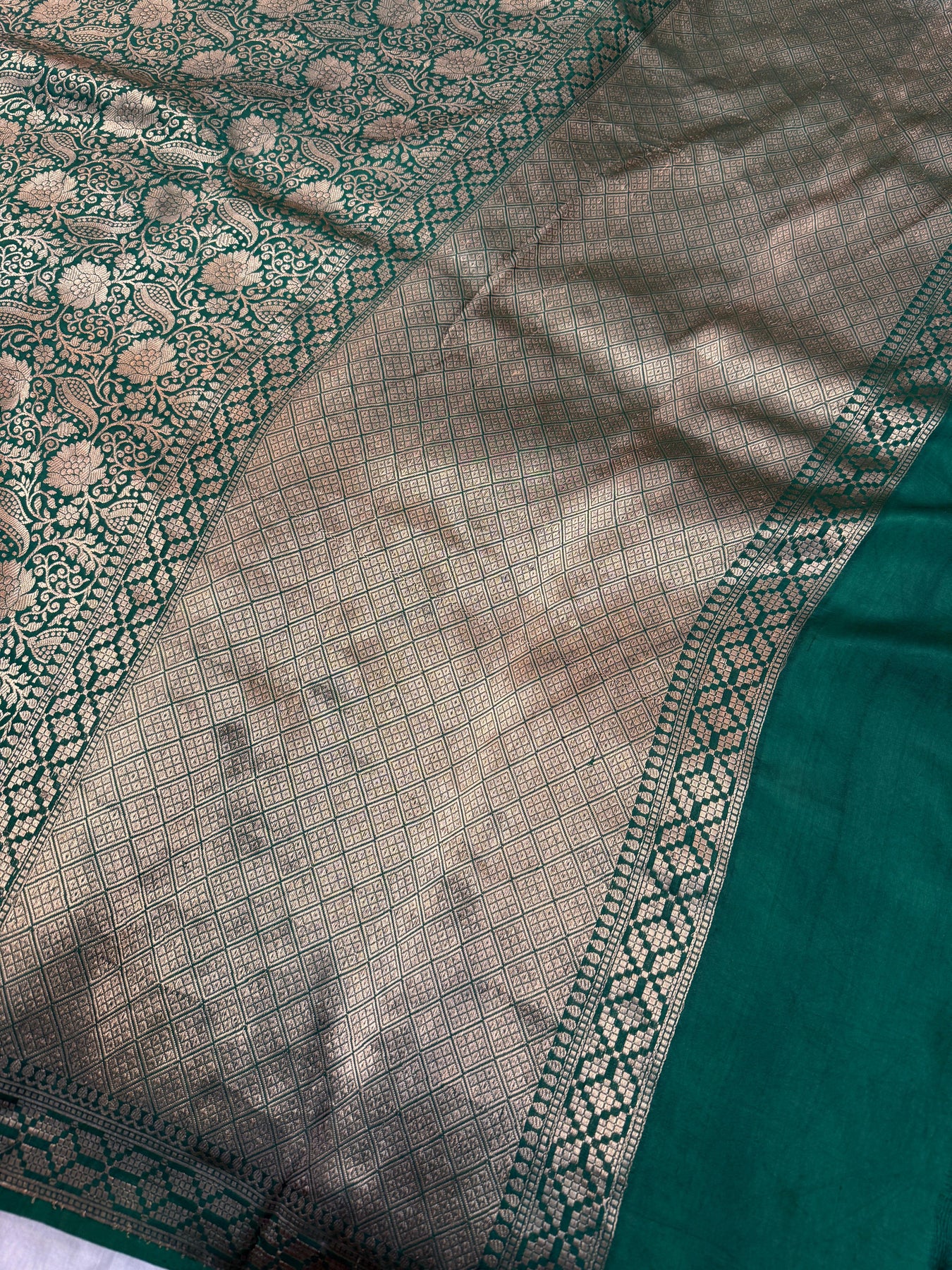 - Color - Bottle Green Banarasi saree.