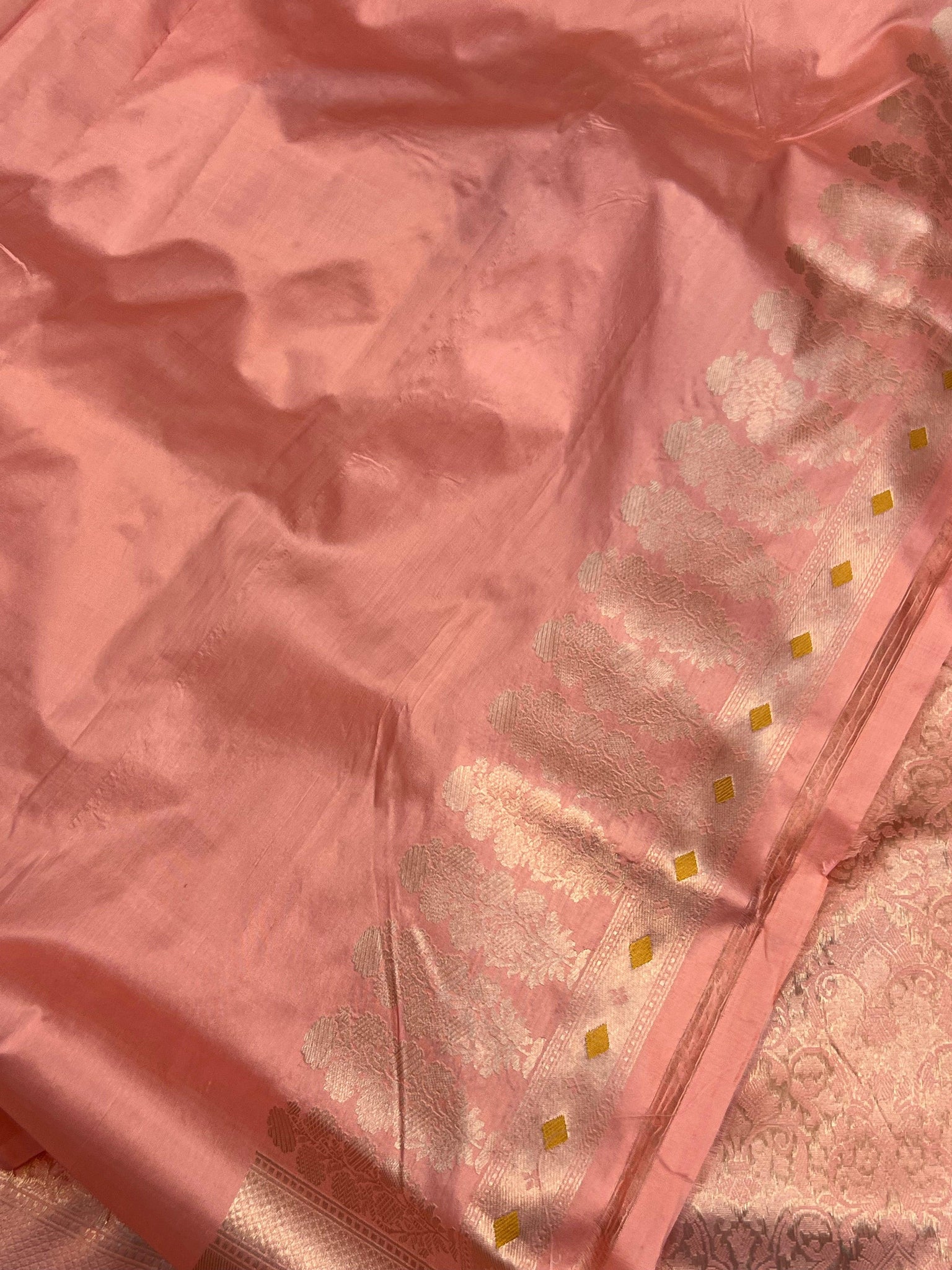 Indulge in the timeless elegance of this pure Katan silk handloom Banarasi saree, meticulously crafted with exquisite allover brocade work. The saree features a lovely geometric design woven in shimmering golden zari, creating a rich and captivating texture that exudes sophistication. A stunning designer border with Meenakari work frames the saree, adding vibrant color accents and enhancing its regal appeal. Perfect for weddings, festivities, and grand occasions, this luxurious drape is paired with a plain blouse piece featuring a coordinating border, offering a perfect balance to the ornate detailing. Elevate your ethnic wardrobe with this masterpiece that seamlessly blends traditional Banarasi artistry with modern charm.