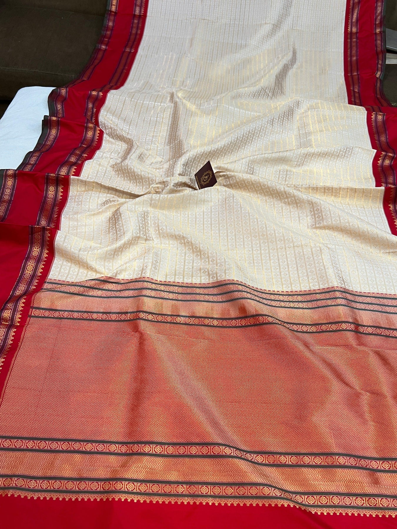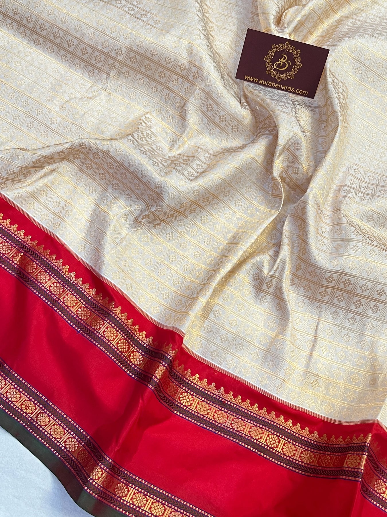 Framing the saree is a striking red contrast Banarasi border, lending bold definition and a regal touch to the elegant white canvas. The interplay of white and red evokes a timeless aesthetic rooted in heritage yet effortlessly contemporary.