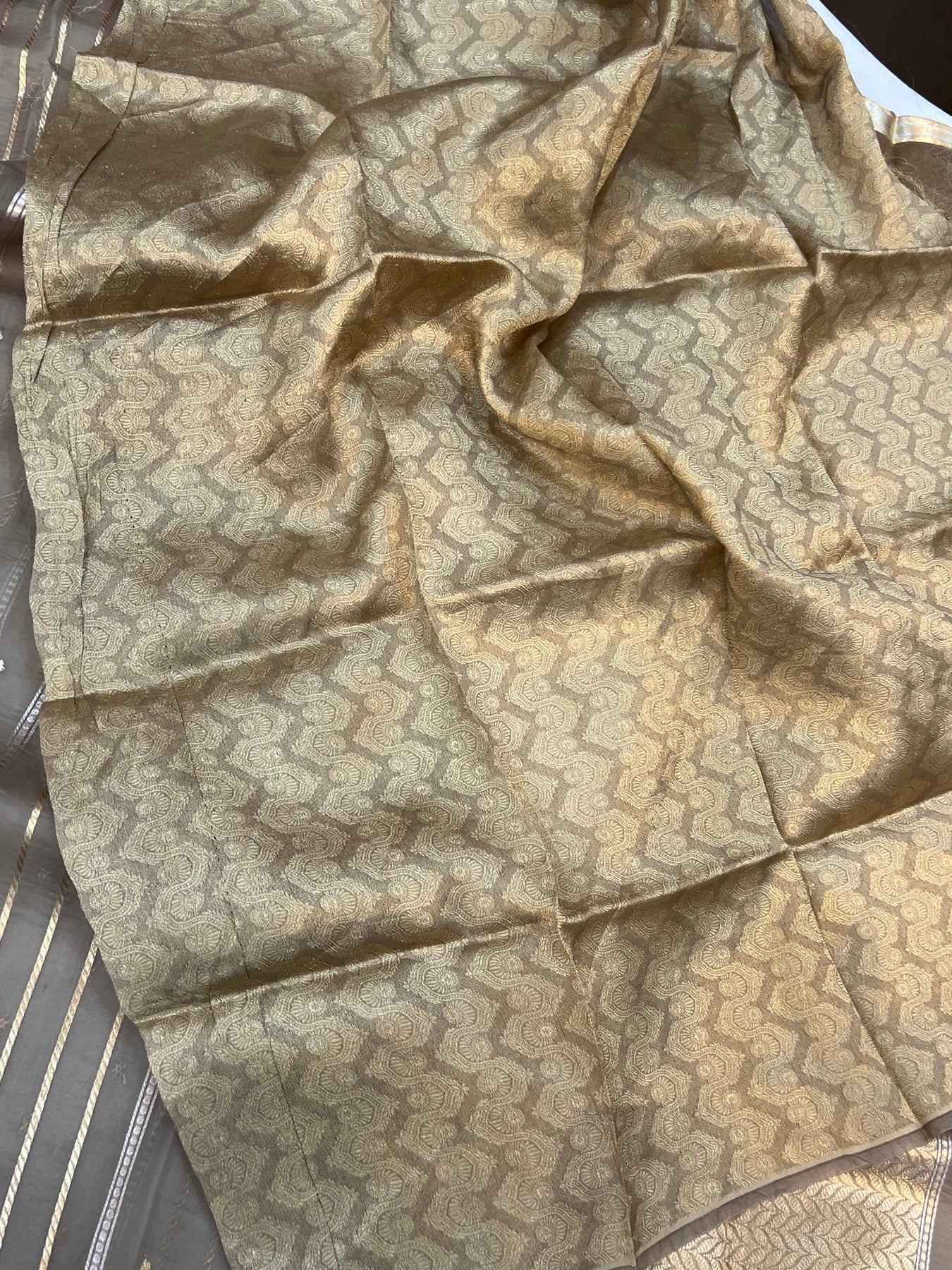 An amazing Handwoven Kora Silk in a Grey color to take your breath away. This vintage piece has allover Kadwa(Kadhua) stripes in golden and silver zari. This handmade treasure exemplifies the Craftsmanship of our Weavers, who have kept the art alive by passing the knowledge from generation to generation. It comes with a brocade blouse piece.