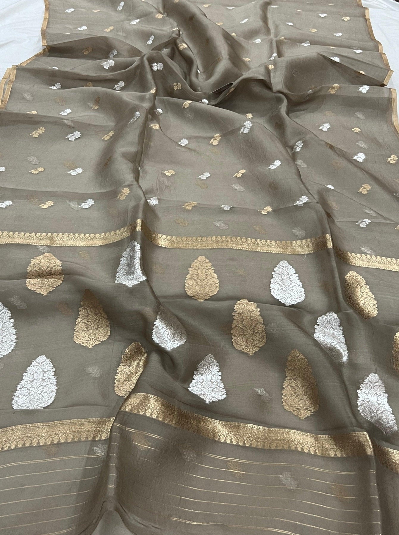 Grey Banarasi Handloom Kora Silk Saree - Aura Benaras